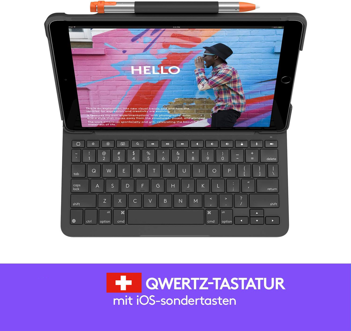 Tastatursprache: Schweizerisch. DasLogitech Slim Folio bietet Ihnen die perfekte Mischung aus Schutz, Komfort und Produktivität – egal ob im Café, im Büro oder zu Hause. Zeichen-Modus: Klappen Sie die Tastatur flach um, um bequem mit dem Apple Pencil zu skizzieren oder Notizen zu schreiben.