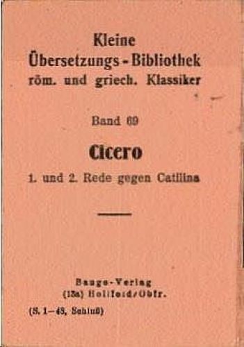 Cicero, Marcus Tullius: [Orationes in Catilinam]; Teil: [1]. Rede gegen Catilina. Kleine Übersetzungs-Bibliothek röm. und griech. Klassiker ; Bd. : Bange, [1950]. Diese Kosten trägt der Käufer.