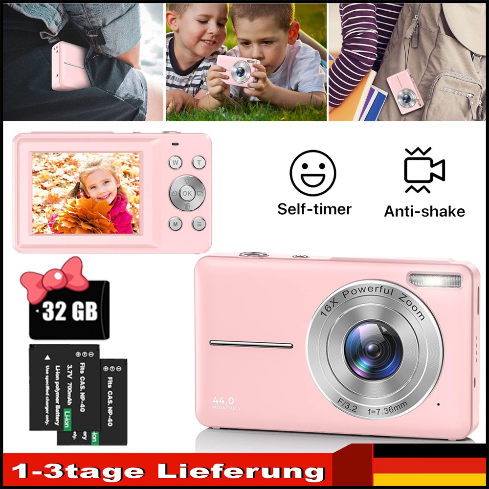 Merkmale:✔️ Diese Digitalkamera verfügt über eine HD-Bildauflösung von 1080P und eine Videoauflösung von 44 MP sowie ein integriertes Mikrofon und einen Lautsprecher, mit denen Sie HD-Fotos oder -Videos aufnehmen können, um großartige Momente festzuhalten und unvergessliche Momente festzuhalten.✔️ Diese Fotokamera kann als Webcam verwendet werden. Schalten Sie zuerst die Digitalkameras aus, schließen Sie die Kamera mit dem USB-Kabel an, drücken Sie gleichzeitig die Ein-/Aus-Taste und den Auslöser, um in den Webcam-Modus zu wechseln, und dann können Sie einen Videoanruf tätigen. Sie können auch Kameradateien auf Ihren Computer übertragen, um Ihre Fotos und Videos auf Facebook, YouTube .