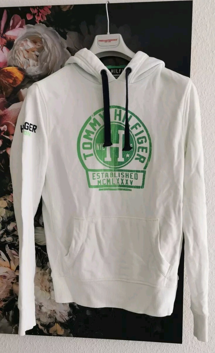 TOMMY HILFIGER UNISEX DAMEN/HERREN HOODIE, KAPUZEN PULLOVER WEISS/GRÜN Gr. S wenig getragen, wie neu Tierfreier Nichtraucherhaushalt, ohne Gewährleistung da Privatverkauf