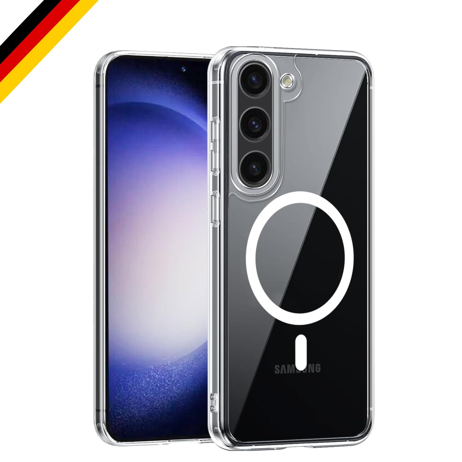 Transparente Magnetische Handyhülle für Samsung Galaxy S23 mit Kickstand, Kratzfest & Stoßdämpfend. Die Hülle ist kompatibel mit MagSafe-Zubehör dank eingelagerter N52 Magnete. Diese Hülle ist leicht und schlank, bietet dennoch einen sicheren Schutz.