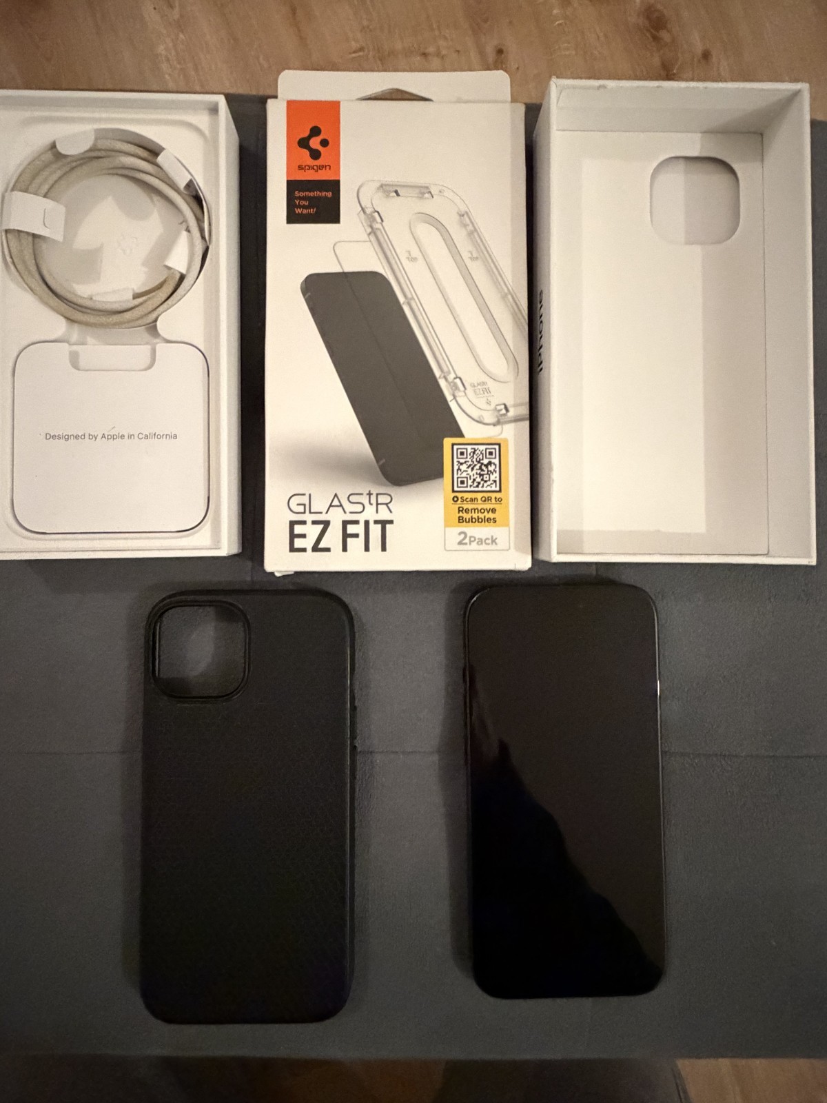Ich verkaufe mein Iphone 15 in schwarz, ohne Simlock. Das Handy ist technisch in einem einwandfreien Zustand. Das Gerät wurde durchgehend mit einer Handyhülle, Displayschutz und Kameraschutz verwendet. Kleinere Lackabplatzer auf dem Gehäuse (Rückseite/an den Seiten) sichtbar. Die Akkuleistung liegt bei 88%. Versand in OVP mit sämtlichen Zubehör. Zusätzlich lege ich meine Schutzhülle sowie ein Displayschutzsatz von Spigen bei. Eine Rücknahme wird ausgeschlossen, da Privatverkauf.