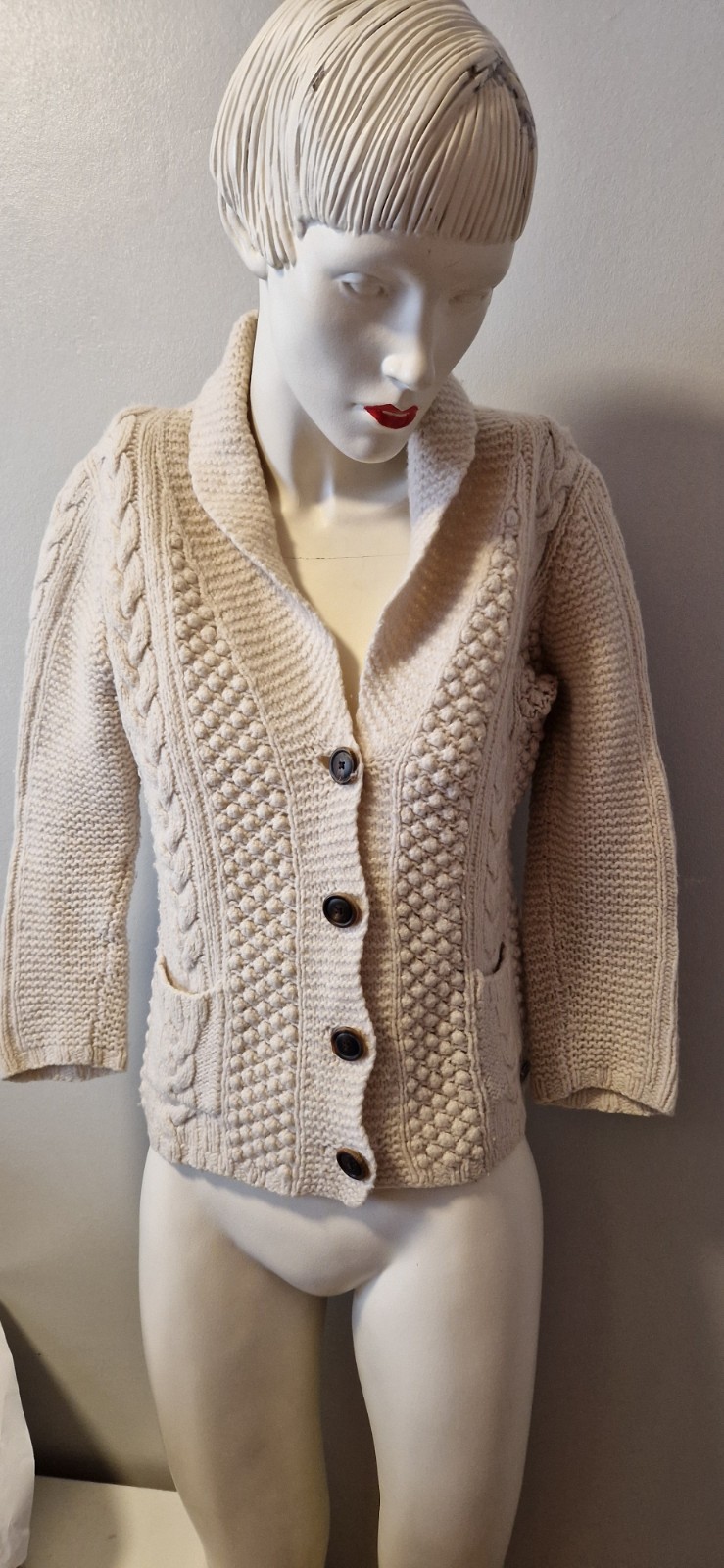Diese elegante Strickjacke von Marc O'Polo in Größe S besticht durch ihr hochwertiges Material, bestehend aus 80% Wolle und 20% Polyamid, und präsentiert sich in einem zeitlosen Cremefarbton. Mit ihrem klassischen Strickgewebe und dem femininen Schnitt ist diese Damen-Strickjacke ein vielseitiges Kleidungsstück für Ihre Garderobe, das sowohl Komfort als auch Stil verspricht. Die Kombination aus Qualität und Design macht diese Strickjacke zu einem Must-have für jede modebewusste Frau. Länge von hinten ab Kragen ca 62 cm Brustweite einfach ungedehnt ca 50 cm Ärmeln Länge ca 51 cm Privat Verkauf keine Rücknahme Garantie und Gewährleistung.