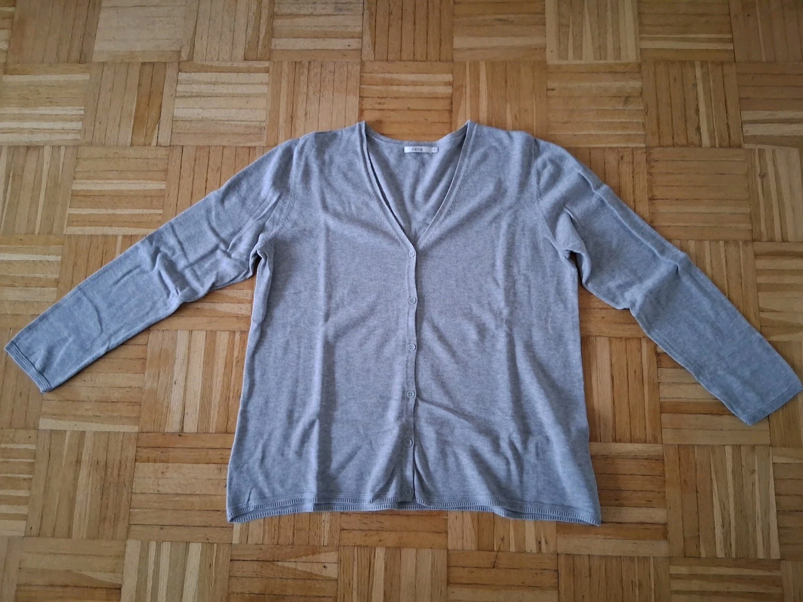 Verkaufe getragene, gut erhaltene Strickjacke von Cecil in Gr. L. Material: 60% Baumwolle und 40% Viskose. Maße: Breite 55 cm, Armlänge ab Achsel 44 cm und Rückenlänge 60cm. Privatverkauf: Keine Garantie und keine Rücknahme der Ware. Bezahlung der Ware innerhalb von 7 Tagen nach Auktionsende. Versand 1-2 Tage nach Zahlungseingang.