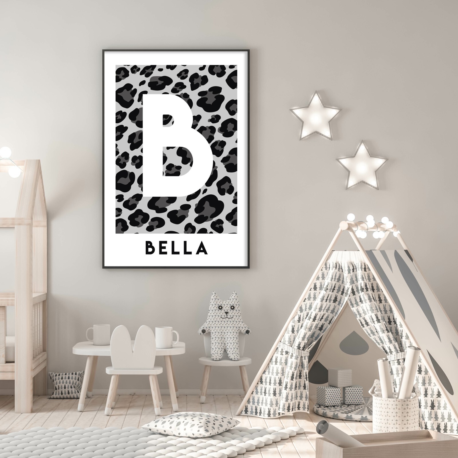 Wandbild personalisiert grau Tiermotiv Initiale Name Druck Leopard Deko 628