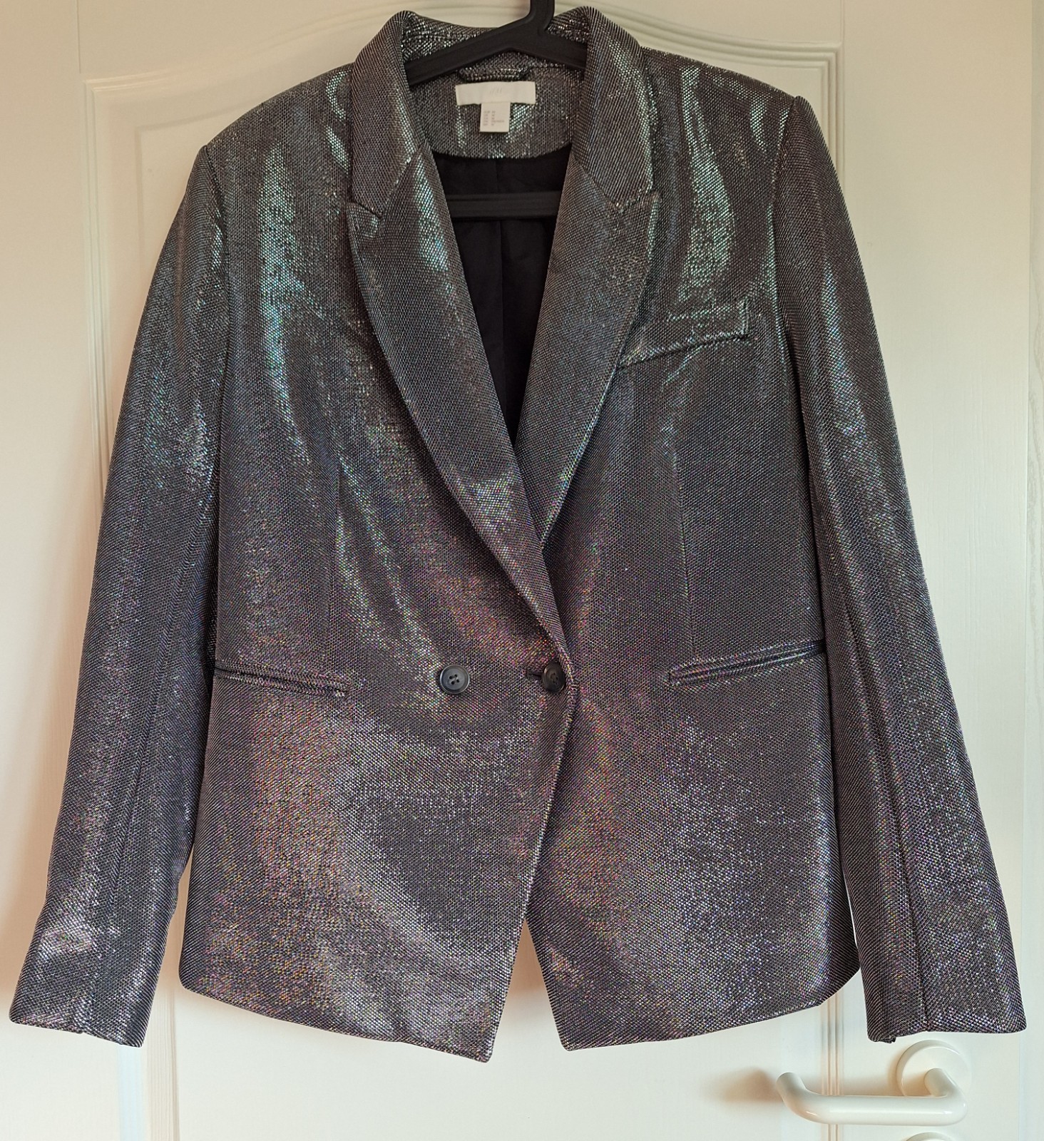 Eleganz trifft auf Funktionalität in dieser Damen-Sakkojacke von H&M, ideal für stilvolle Business-Anlässe. Der glitzernde Blazer in Größe 44, gehalten in einem schimmernden Silberton, setzt modische Akzente und verleiht jeder Garderobe einen Hauch von Glamour. Mit ihrem halblangen Schnitt, langen Ärmeln und klassischem Knopfverschluss repräsentiert dieses Modell einen zeitlosen Business-Stil. Ideal für die, die Wert auf eine Kombination aus Komfort und Eleganz legen.