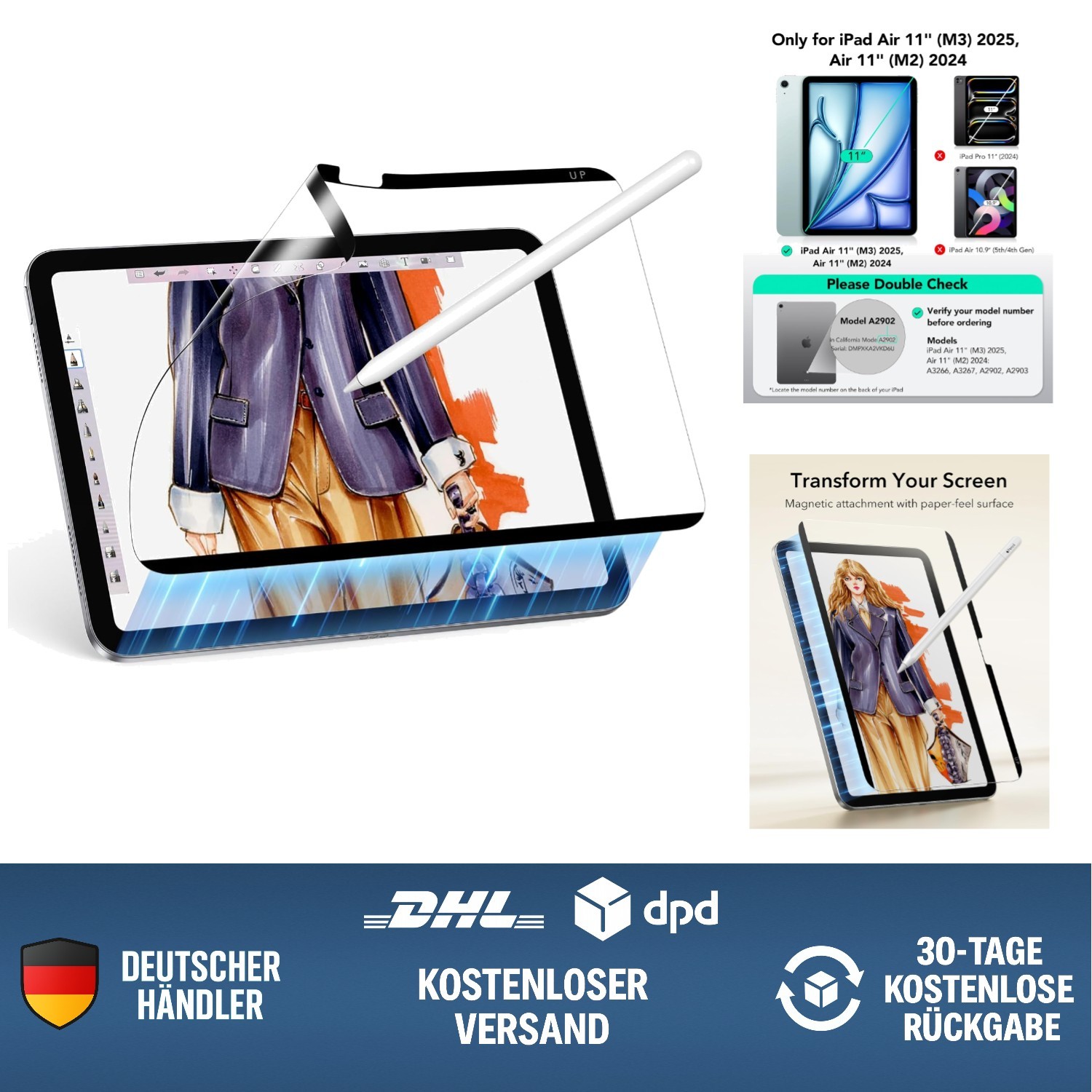 Entdecken Sie den idealen Begleiter für Ihr iPad Air 11” M3 (2025) und M2 (2024). Die spezielle Oberfläche sorgt für ein professionelles Schreibgefühl, ideal für kreative Gestaltung und Notizen. Dank der magnetischen Kanten ist die Befestigung am Display kinderleicht und sorgt für einen sicheren Halt, lässt sich aber auch mühelos entfernen.