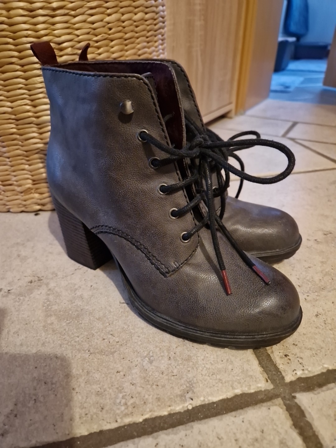 Die eleganten Tamaris Damen Stiefelette in Größe 40 präsentieren sich in einem zeitlosen Grau, das sich mühelos in Ihre Alltagsgarderobe einfügt. Das qualitativ hochwertige Kunstleder verleiht den Schuhen eine edle Optik, während der mittelhohe Blockabsatz von 5 bis 7,5 cm Höhe für einen angenehmen Tragekomfort sorgt. Ideal für Freizeitanlässe, bieten diese Stiefel eine perfekte Kombination aus Stil und Bequemlichkeit. Mit ihrem klassischen Design und der nicht individualisierten Gestaltung sind diese Boots eine vielseitige Ergänzung für jede Schuhsammlung. privat verkauft ohne Garantie