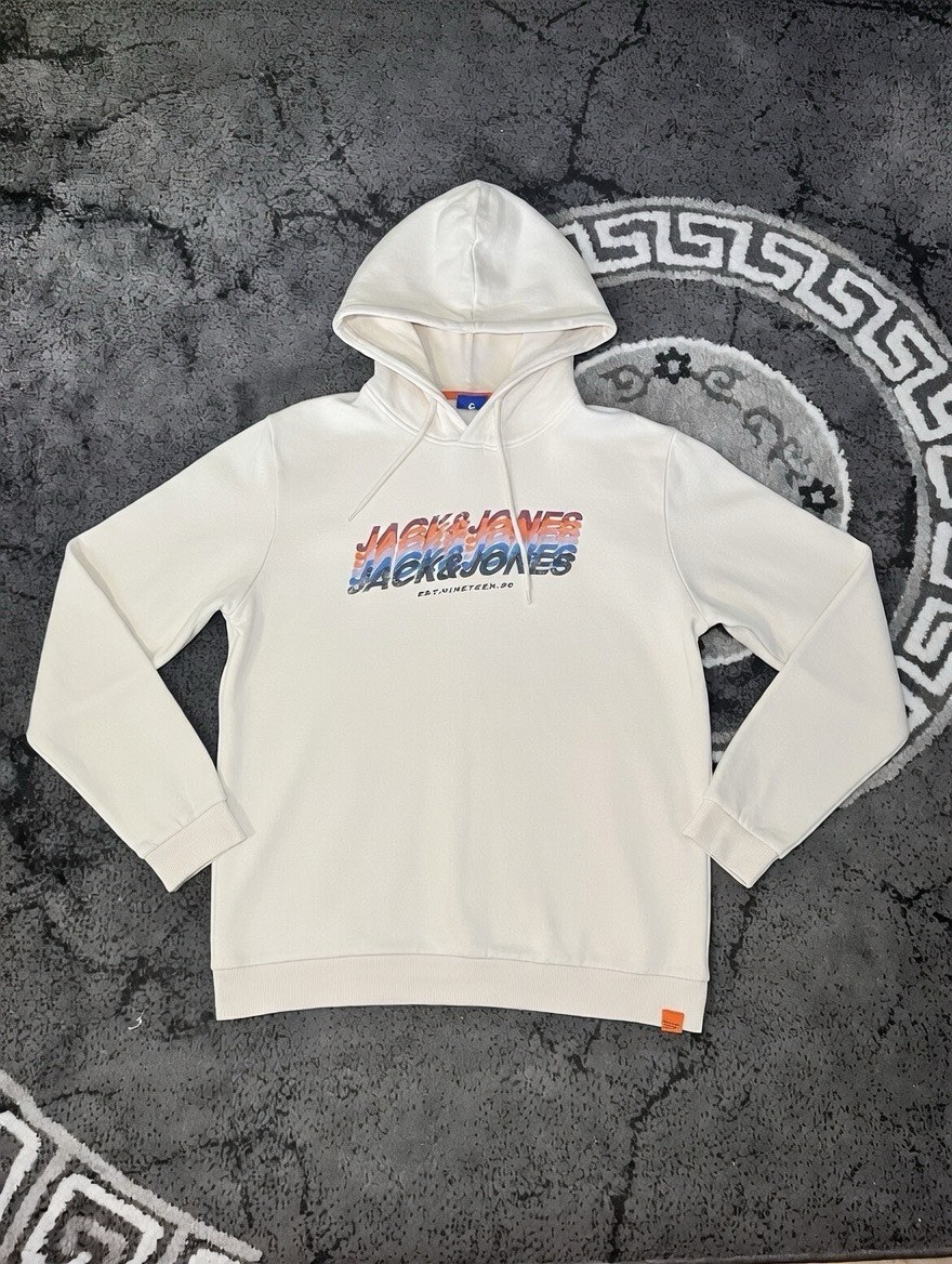 Verkaufe Jack & Jones Originals Hoodie in Weiß. Details: • Buntes Gradient-Logo „JACK&JONES“ + „EST. NINETEEN.90“ • Kapuze mit Kordel, Kangaroo-Tasche • Weicher Sweat-Stoff, Jack & Jones Originals-Etikett Zustand: Gut bis neuwertig – sauber, keine Flecken oder Abnutzung.