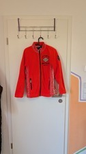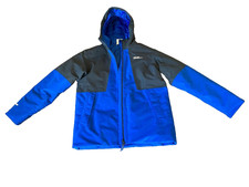 Winterjacke, Kinder Jungen, Gr. 164 (L), Tom Tailor, blau, mit Kapuze. 2 seitliche Bauchtaschen mit Druckknöpfen. Am linken Ärmel ist ein Loch/Riss (Triangel), am rechten Ärmel ist ein ganz kleines Loch (s. Fotos). Länge: 63 cm