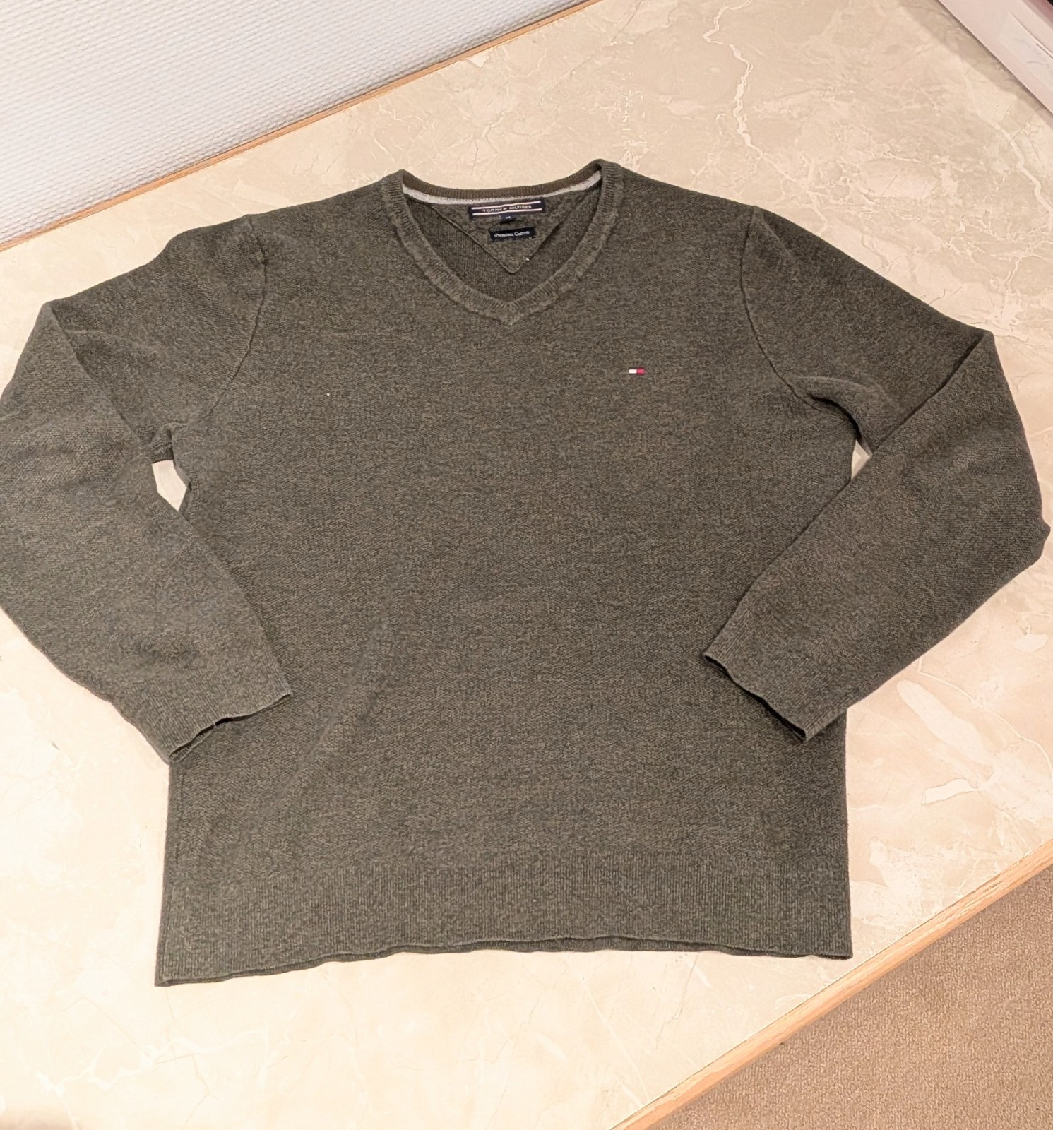 Sie kaufen hier einen original Tommy Hilfiger Herrenpullover in der Farbe grün mit leichtem V-Ausschnitt. Die Größe ist M mit einer Rückenlänge von 56cm und einer Schulterbreite von 47cm. Der Pullover fällt etwas kleiner aus und ist in einem sehr guten Zustand ohne Schäden.