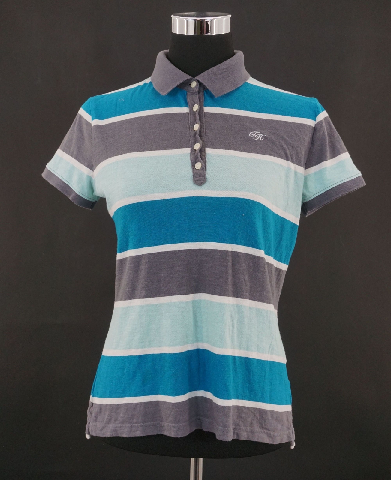 Tommy Hilfiger Poloshirt / Größe M / türkis, grau gestreift / Poloshirt mit Knopfleiste / Stoff - Baumwolle oder Baumwolle-Mischung (Etikett entfernt) / Zustand: getragen - gut bis sehr gut (weitere Informationen in der Artikelbeschreibung) +++ BITTE BEACHTEN UND PRÜFEN SIE DIE FOLGENDEN MASSANGABEN +++ Schulterbreite: ca. 41 cm / Brustweite: ca. 45 cm / Gesamtlänge: ca. 61 cm.