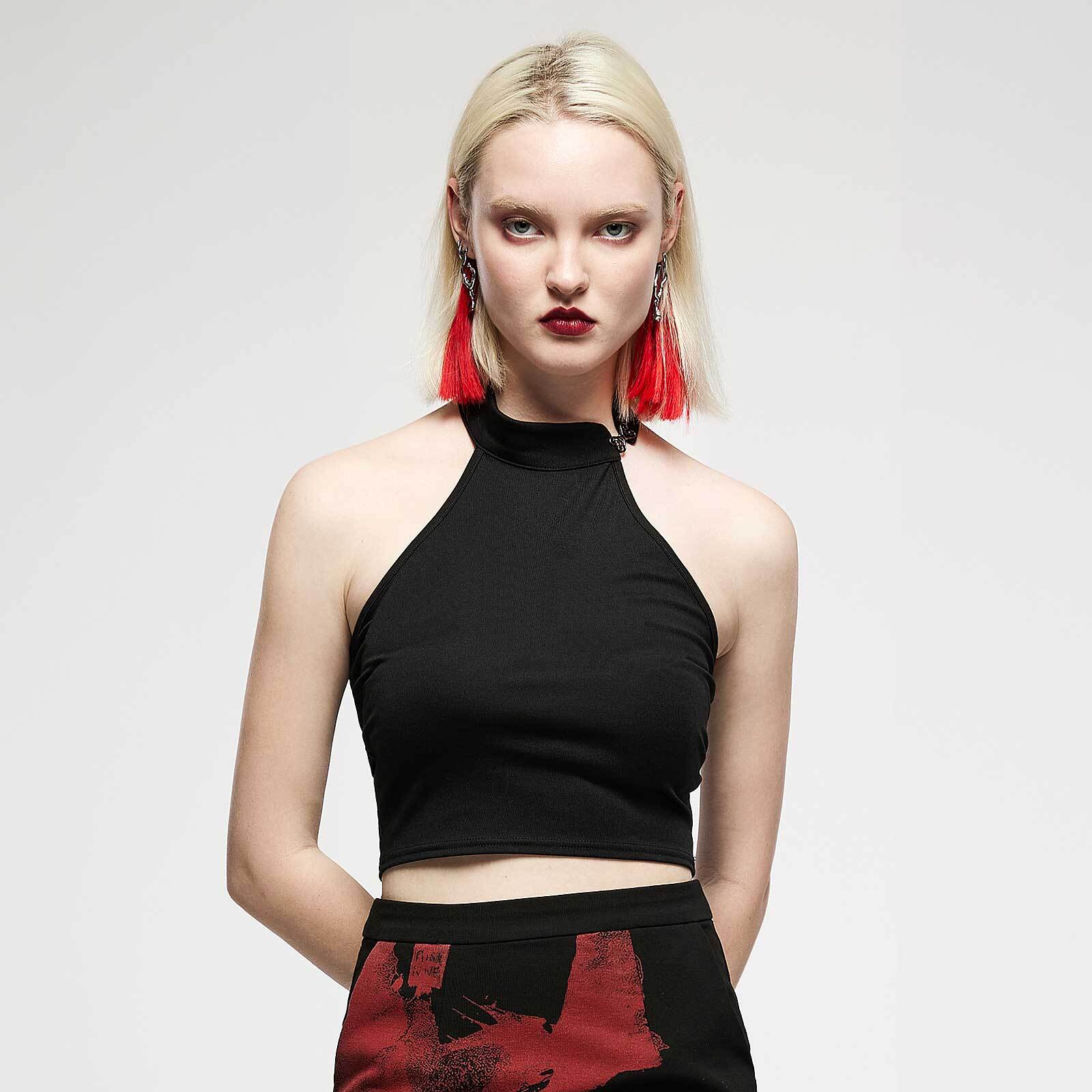 PUNK RAVE Chine Neckholder Top Schwarz Mandarin Style Stretch GOTHIC