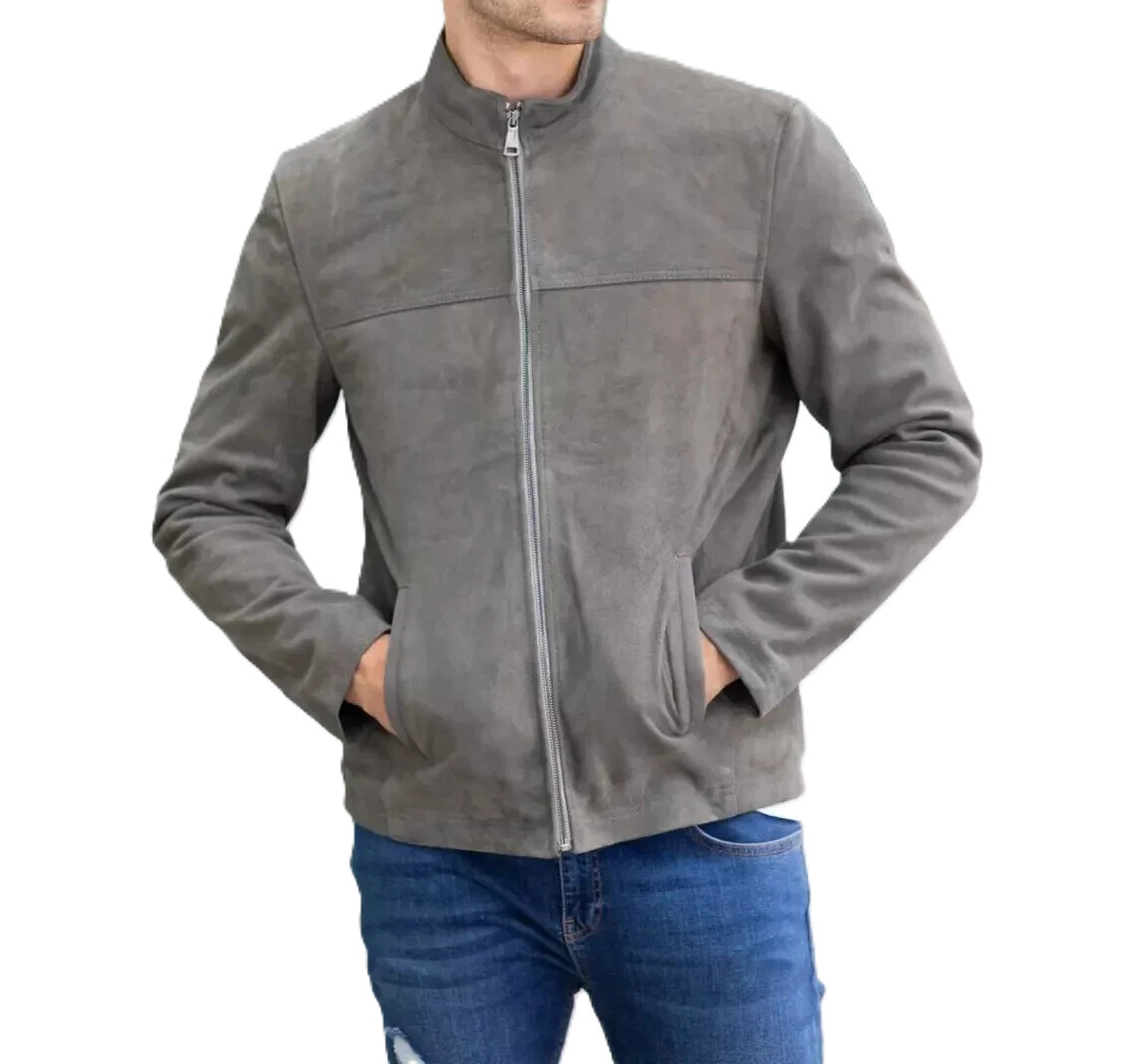 Herren Echt Wildleder Lederjacke Grau Slim Fit Reißverschluss Biker...
