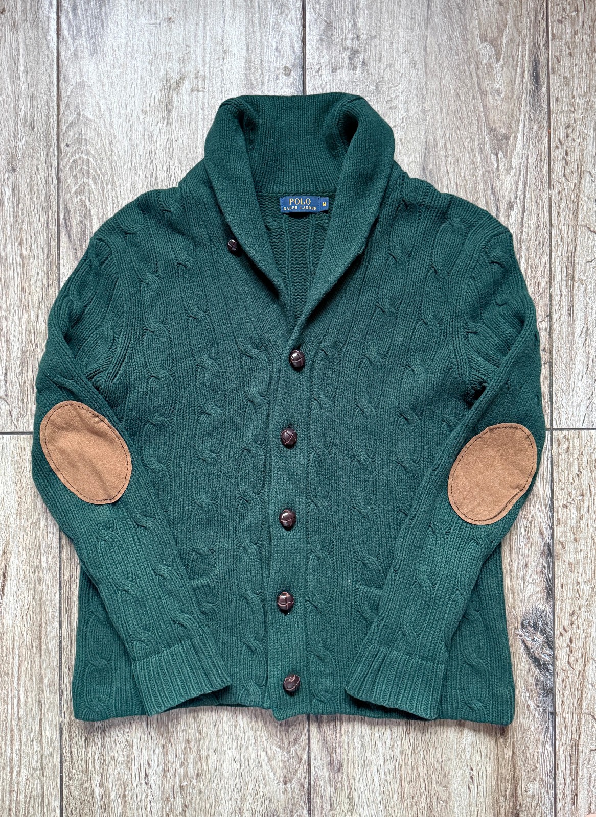 Polo Ralph Lauren Herren Cardigan 100% Wolle M Zopfmuster mit Ellbogen Patches