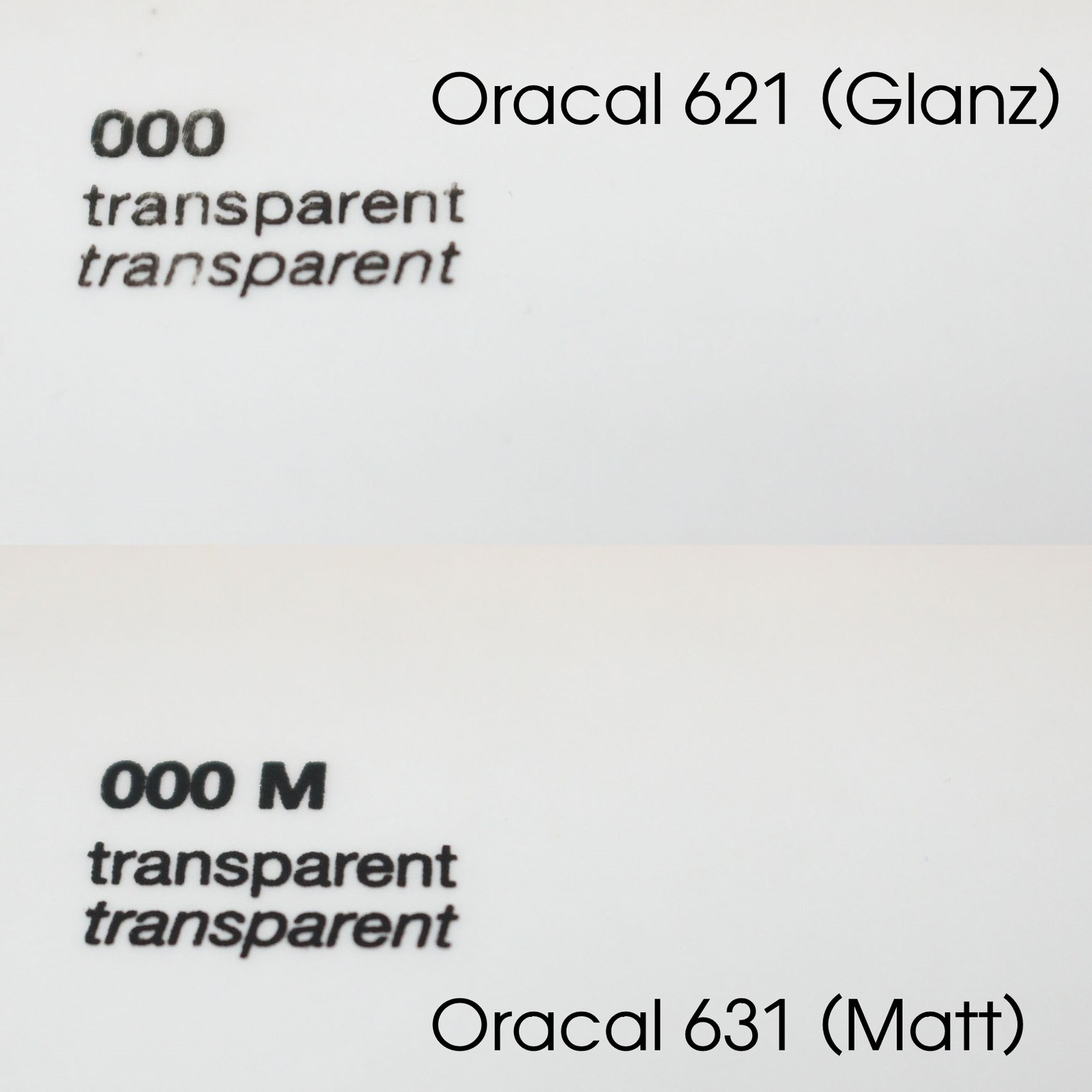 Oracal 621 (Glanz) Economy Cal - Weich PVC Folie (0,075mm) - 45 glänzende Farben - sehr gut geeignet für die Verarbeitung auf Schneidplotteranlagen - Für Markierungen, Beschriftungen und Dekorationen - Haltbarkeit: Schwarz/weiß 4 Jahre, Transparent/farbig/metallic 3 Jahre - Polyacrylat, ablösbar Oracal 631(Matt) Exhibition cal - Weich PVC Folie (0,08mm) - 60 matte Farben - sehr gut geeignet für die Verarbeitung auf Schneidplotteranlagen - Für Markierungen, Beschriftungen und Dekorationen, Austellungs- und Messebau - Haltbarkeit: 3 Jahre - Polyacrylat, ablösbar.