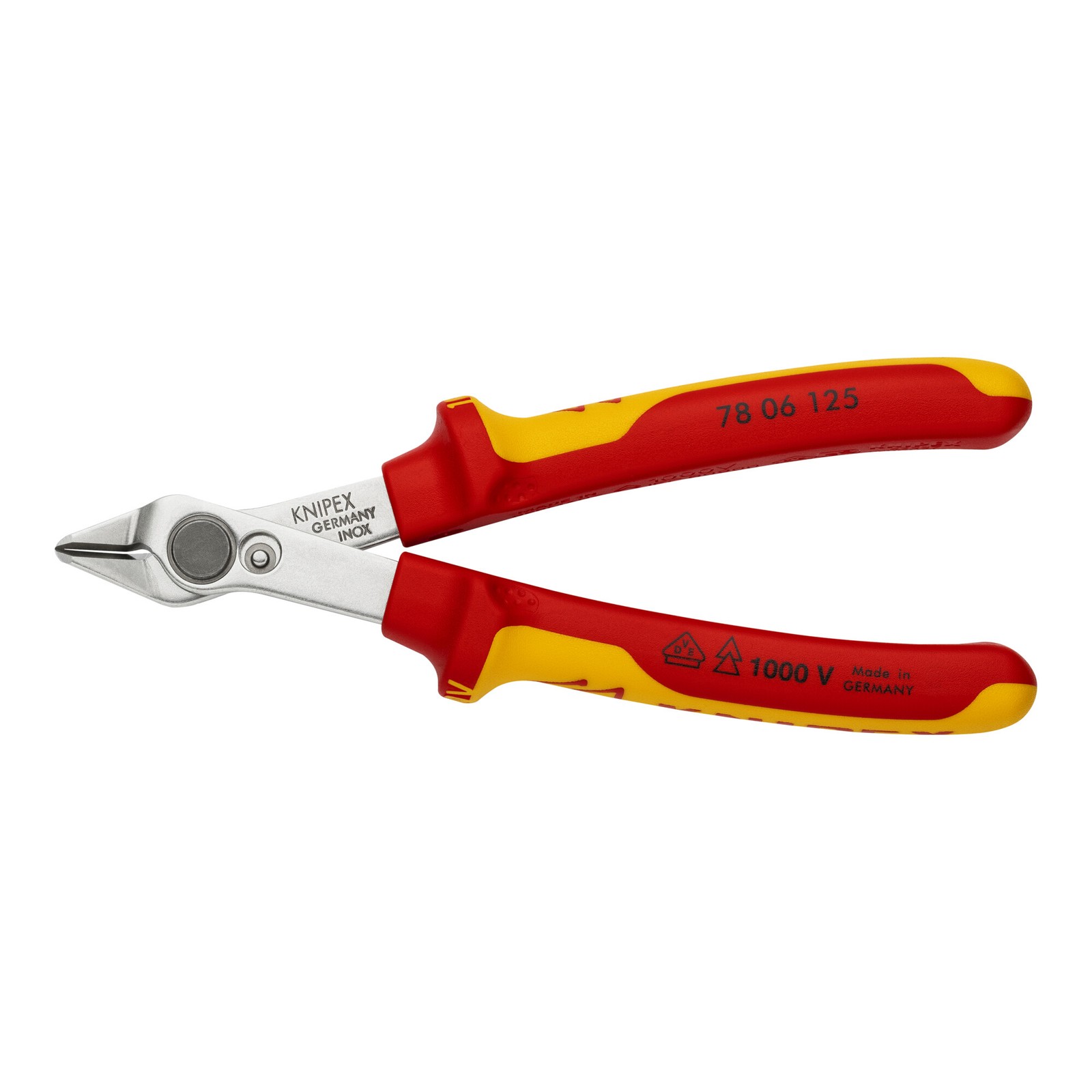 Eigenschaften: − VDE-geprüfte Präzisionszange für feinste Schneidarbeiten, z. B. in Elektronik und Feinmechanik − Komplettiert Ihren VDE-Werkzeugbestand − Geschliffene, sehr scharfe Schneiden ohne Facette − Scherschnitt mit kontrolliertem Micro-Schneidkantenversatz für lange Lebensdauer und ultrapräzisen Schnitt auch dünnster Drähte − Exakt geformte Spitzen schneiden auch anliegende Drähte ab Ø 0,2 mm − Gelenk mit Edelstahlniet − Extrem leichter Gang für ermüdungsarmes Arbeiten − Mit Öffnungsfeder und Öffnungsbegrenzung − Schneidenhärte ca. 54 HRC Technische Daten: − Griffe: Isoliert mit Mehrkomponenten-Hüllen, VDE-geprüft − Griff Feature: VDE, − Kopf: Poliert − Facette: Schneide ohne Facette − Schneidwert mittelharter Draht: 1 mm − Schneidwert weicher Draht: 0.2 - 1.6 mm − Kopfbreite:.