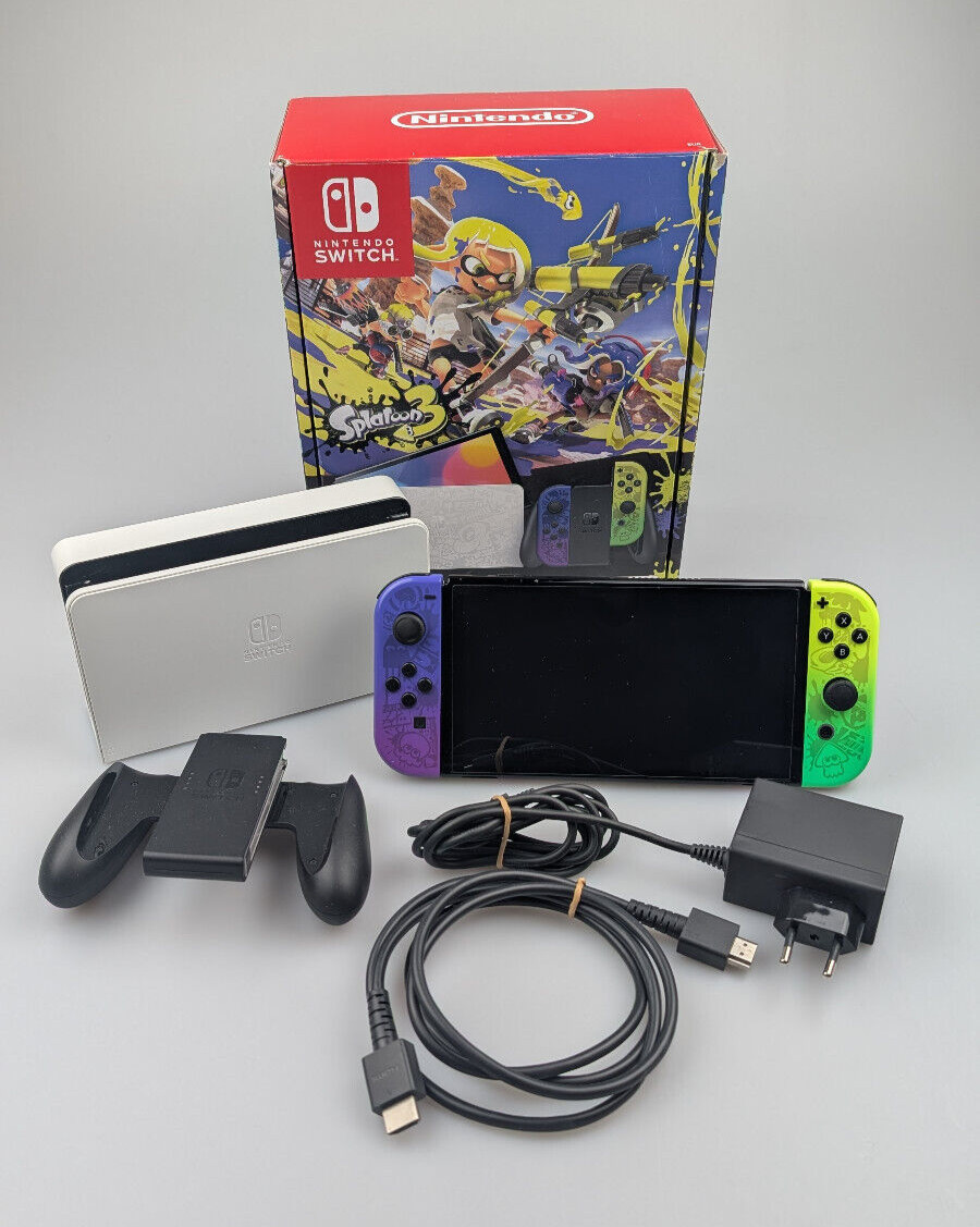 Nintendo Switch OLED-Modell - HEG-001 - Splatoon 3 Edition 64GB. 2x Splatoon 3 -Joy-Cons. Nintendo Switch Dockingstatation (nicht Splatoon Version / ohne Abdeckung hinten). original Nintendo Netzteil.