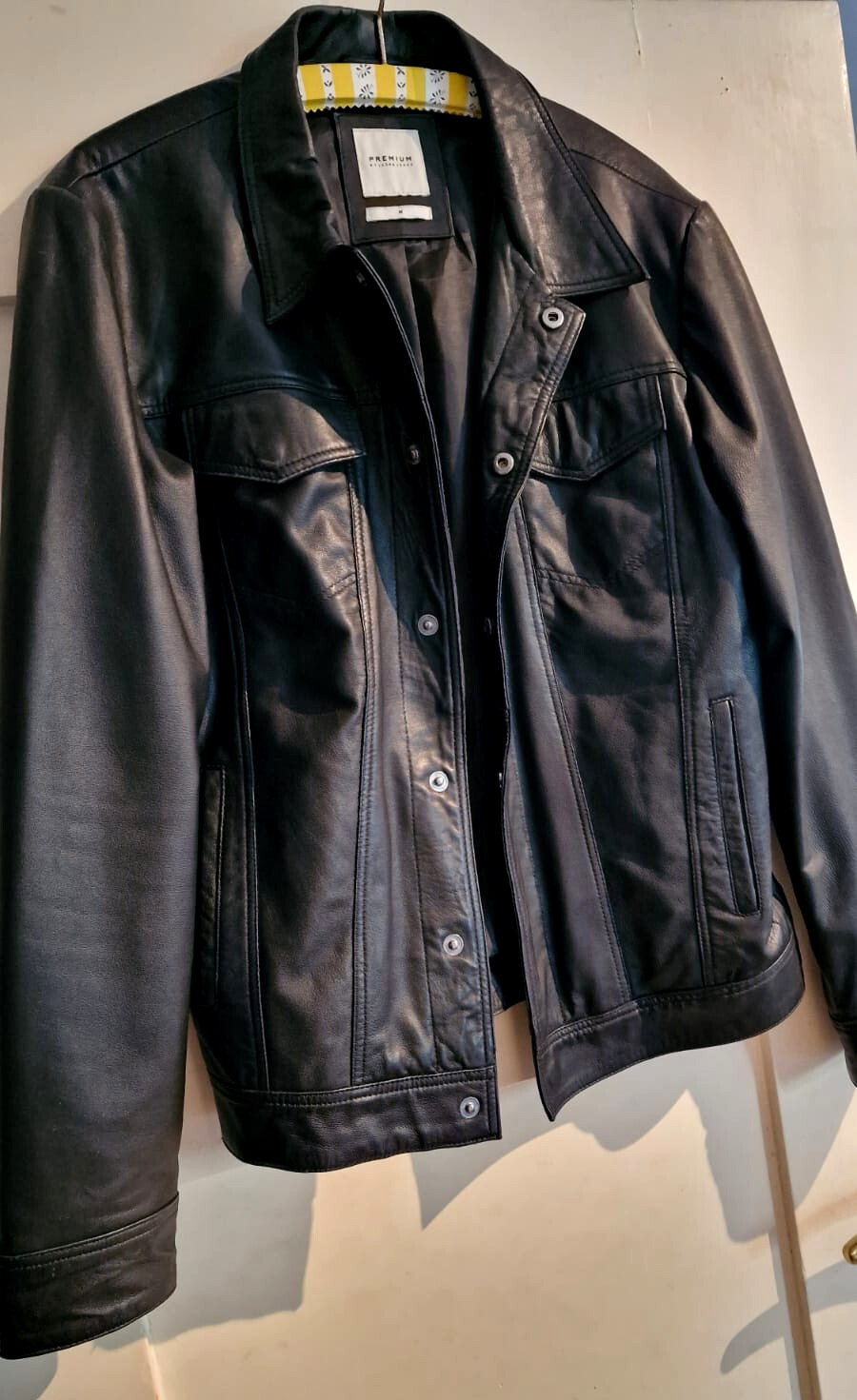 Modische Herren Lederjacke von Jack & Jones Premium Super für den Sommer geeignet, tolle Passform Gebrauchter Artikel aber in sehr gutem Zustand, da kaum getragen Produkttyp Lederjacke aus echtem Leder Futter aus Polyester Größe M Farbe Schwarz Druckknöpfe und Seitentaschen