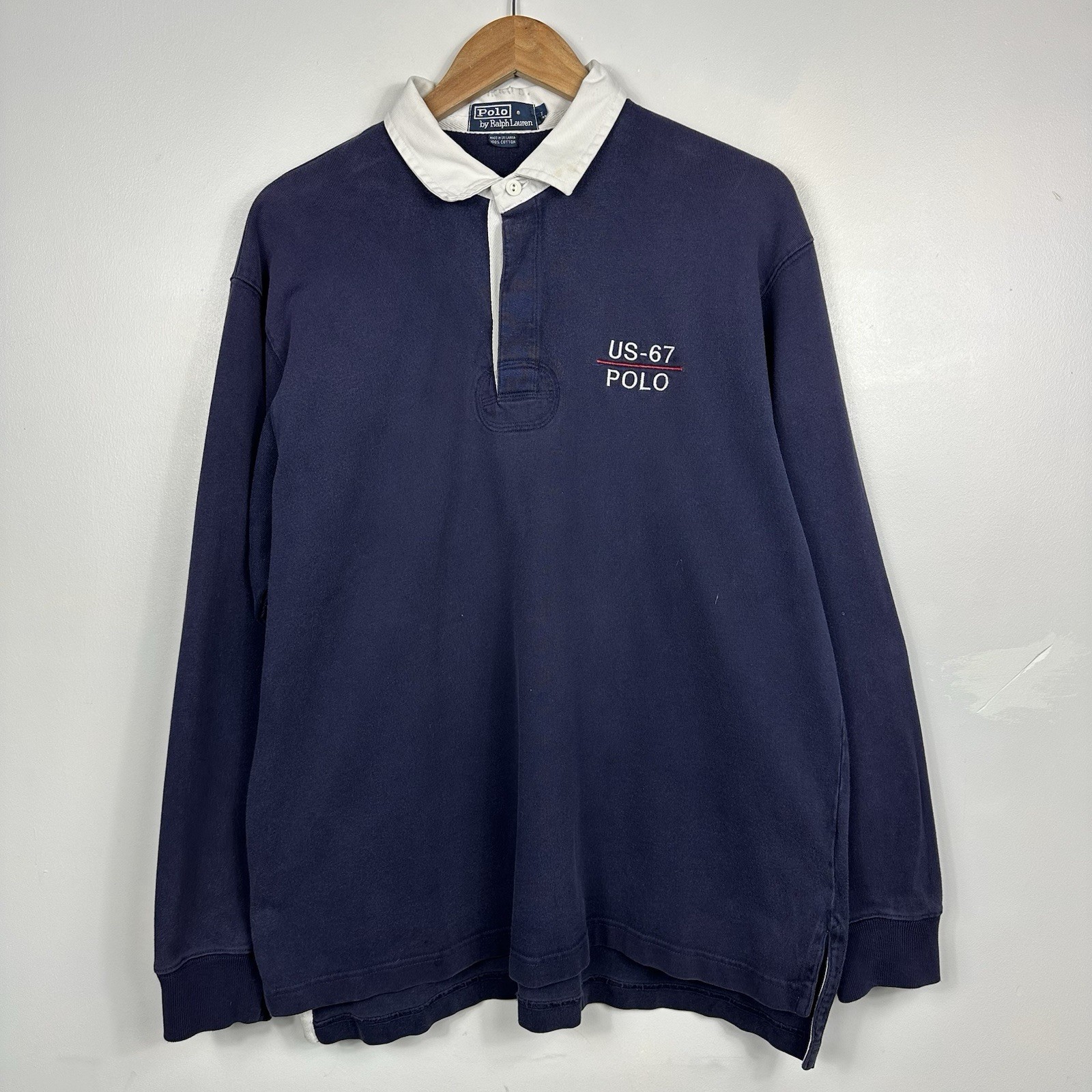 Polo Ralph Lauren Rugby Shirt, US-67 Lo Life Vintage OG Stadium, Mens Large - Navy blue colourway - Embroidered logo on chest - Classic iconic Ralph rugby - Lo life vintage 90s stadium - Has a mark on collar - Has a name written into collar, can just be seen but not too noticeable please see photos Size Mens Large Pit to pit approx 24.5 inches Length approx 29 inches Any questions please message us!