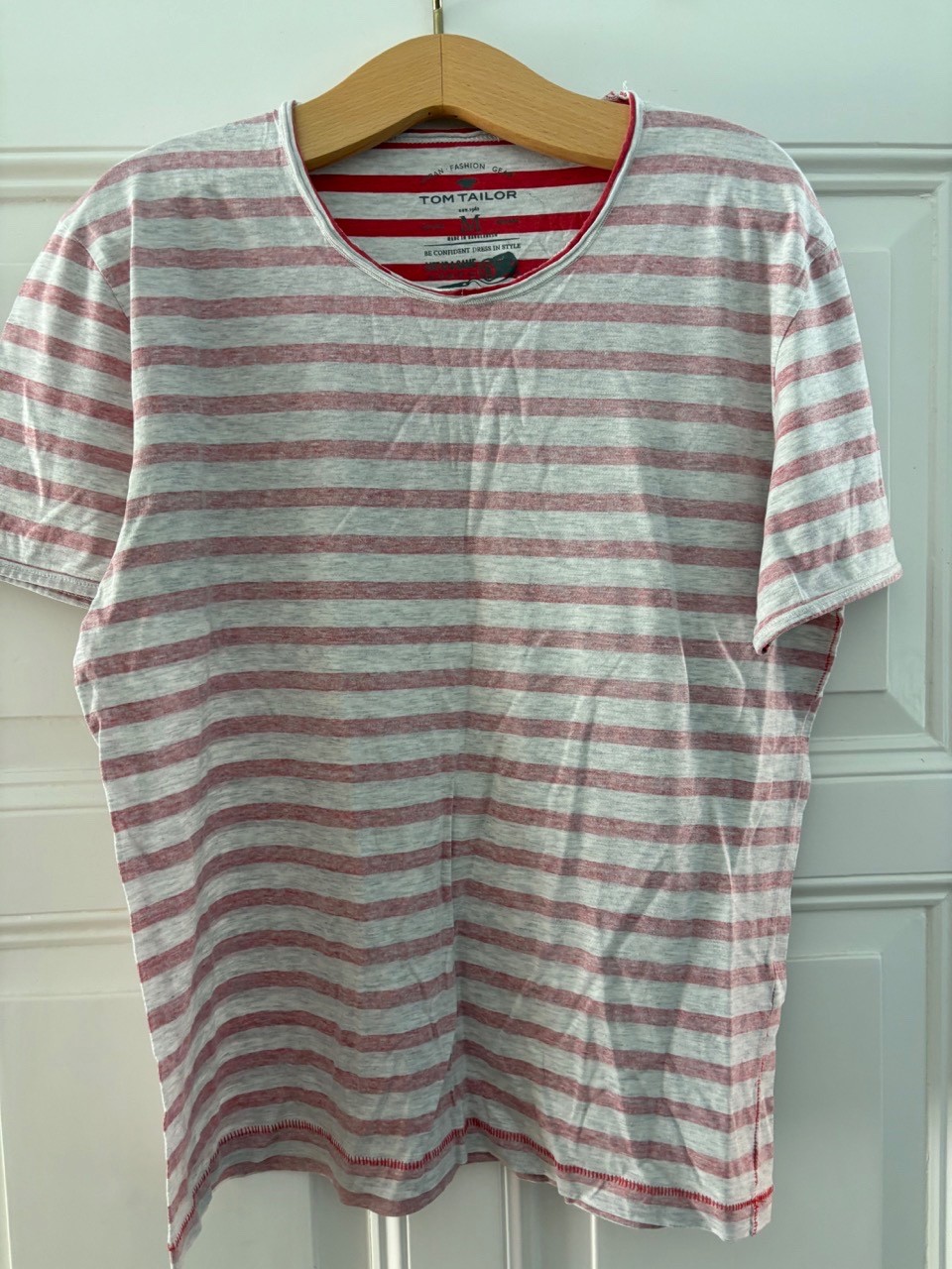 Gebrauchtes Tom Tailor T-Shirt in M (Regular Fit), Rot/Weiß gestreift. Sauber, leichte Waschspuren.