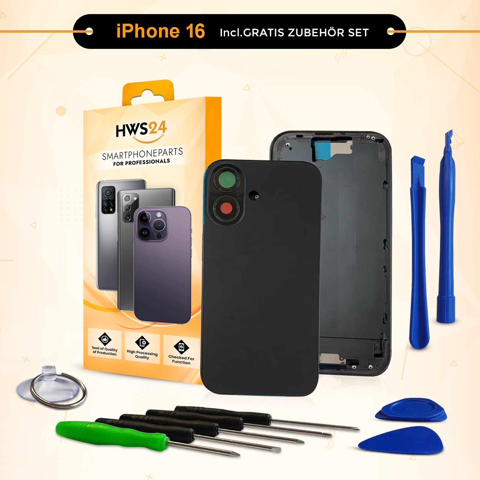 Backcover für iPhone 16 Schwarz Gehäuse Rahmen Rückseite Glas Frame Housing