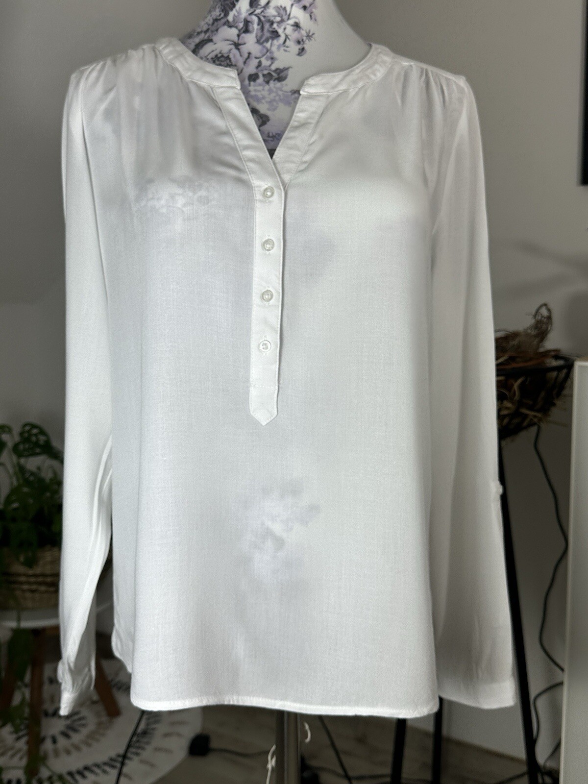 Klassisches Blusenshirt von Street One, sehr flexibel tragbar, sieht zu Jeans ebenso gut aus, wie zu eleganten Bllazern und Cardigans. Selten getragen,daher wie neu.