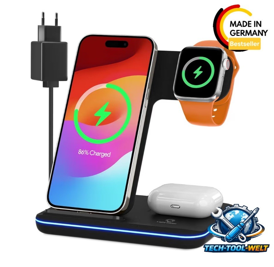 Induktive Ladestation für Apple Wireless Charger 3 in 1: Kabelloses Ladegerät für iP.Hone 17/16/15/14/13/12/11/Pro/Max/XS/XR/X/8/Plus, Apple Watch 2/3/4/5/6/7/8/9/10 und Air.Pods