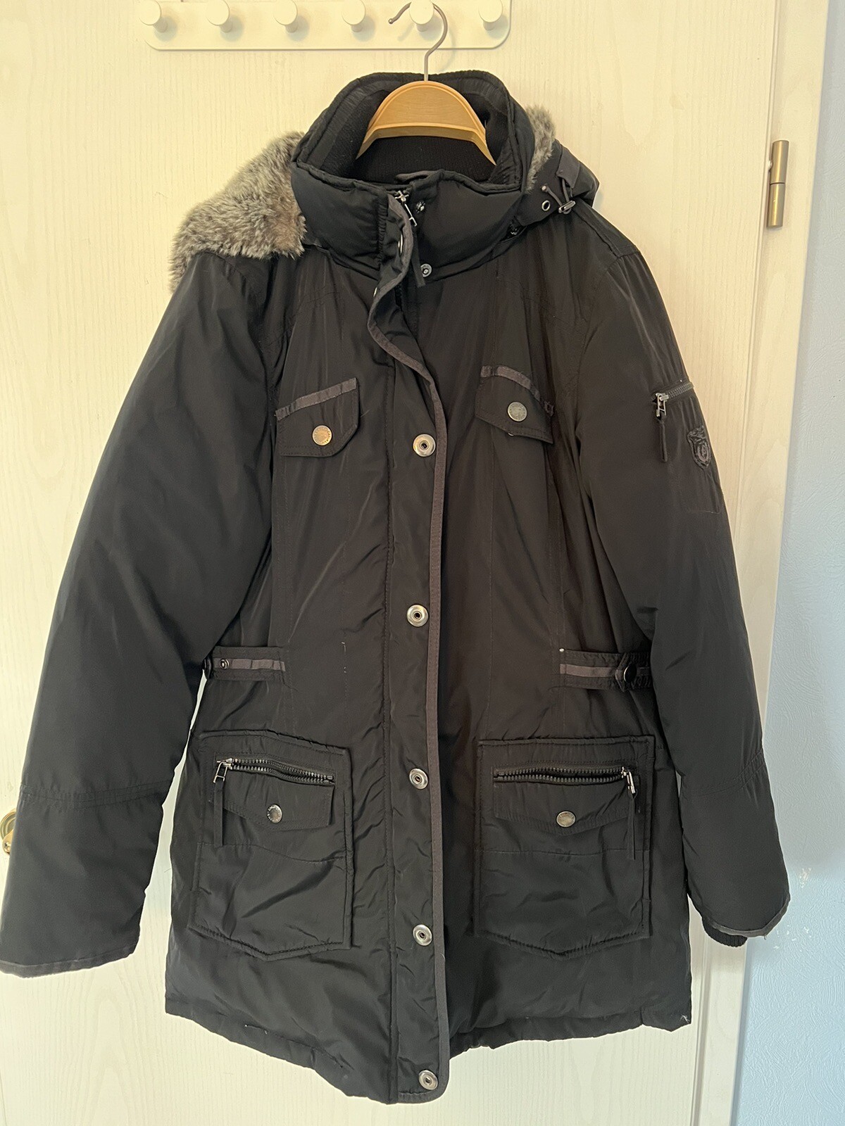 Die schwarze s.Oliver Winterjacke für Damen ist gebraucht, jedoch in sehr gutem Zustand, da sie nur selten getragen wurde. Die Jacke enthält kein Größenetikett. Allerdings habe ich in vergleichbaren Jacken die Größe L Der Mantel ist ideal für die kalte Jahreszeit und Outdoor-Aktivitäten geeignet.