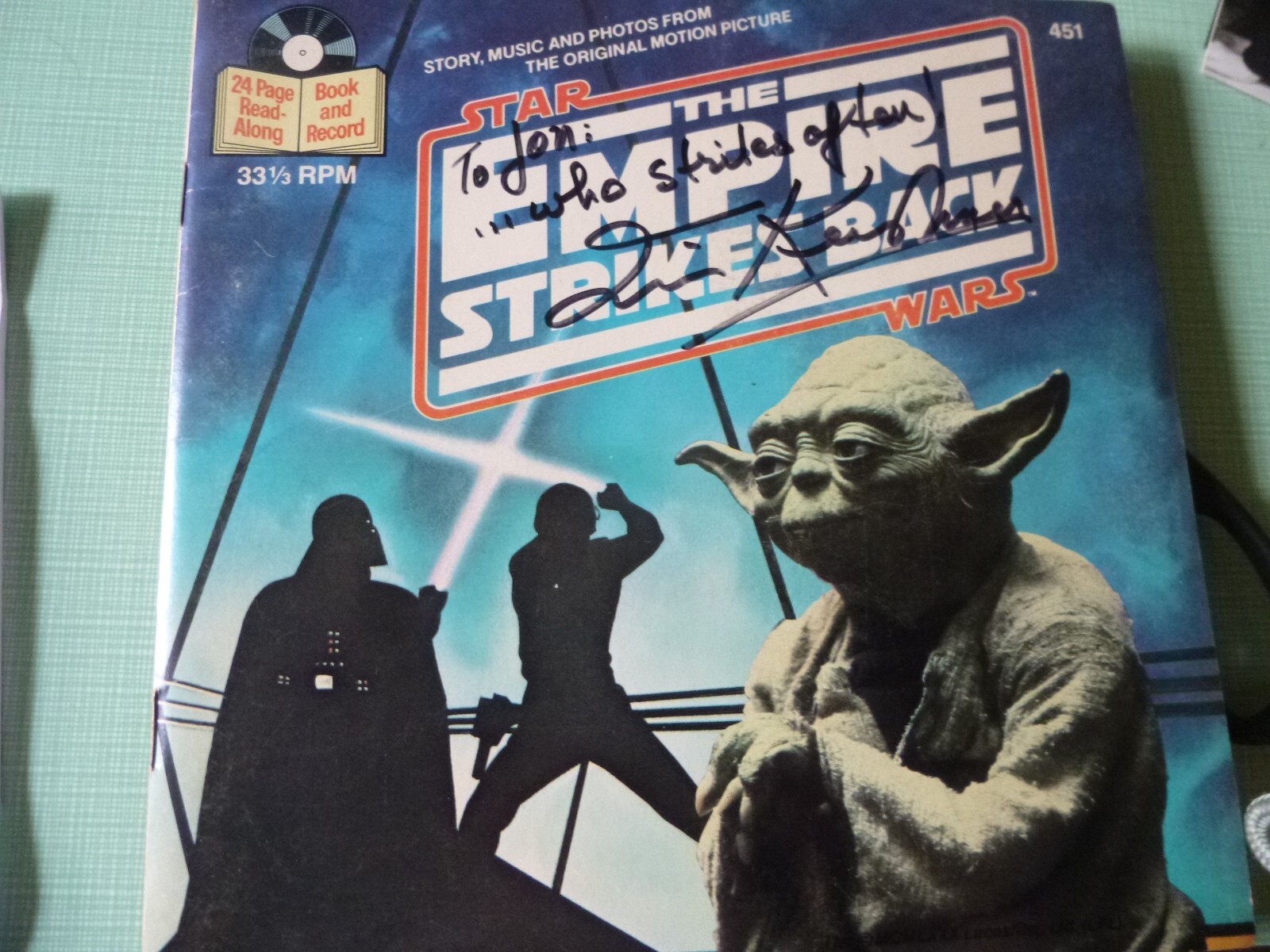 This is a rare opportunity to own a piece of Star Wars history. The Empire Strikes Back read along book and record, hand signed by Irvin Kershner with a dedication to John, is a must-have for any Star Wars fan.