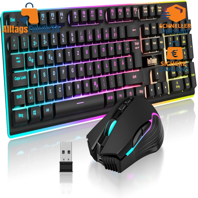 Die RedThunder K10 Kabellose Gaming Tastatur und Maus sind eine leistungsstarke Kombination für Gaming und tägliche Nutzung. Wiederaufladbare Akkus mit 3000 mAh (Tastatur) und 800 mAh (Maus). 1x Tastatur, 1x Maus, 1x USB-Empfänger.