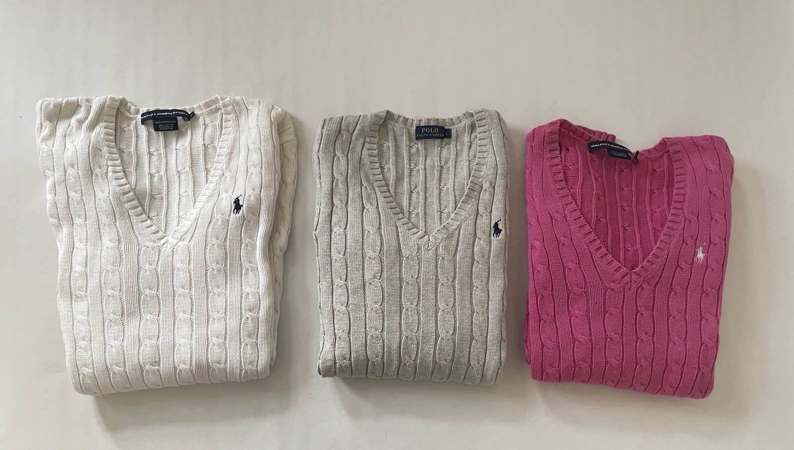 Erleben Sie pure Eleganz und Komfort mit diesem exklusiven Set bestehend aus drei Polo Ralph Lauren Pullovern in Größe L. Diese hochwertigen Strickpullover in den Farbtönen Grau, Weiß und Pink sind ohne Muster gestaltet und verleihen jedem Outfit eine geschmackvolle Note. Angesagte Zopfmuster und dezent eingearbeitete Logos setzen modische Akzente, während die langen Ärmel und die reguläre Passform für optimale Bewegungsfreiheit sorgen. Hergestellt aus reiner Baumwolle, garantieren diese Pullover ein angenehmes Tragegefühl und sind pflegeleicht dank der Eignung für Maschinenwäsche. Ob für die Freizeit oder als stilvolle Ergänzung für alle Jahreszeiten – diese Kleidungsstücke sind vielseitig einsetzbar und verleihen jedem Anlass einen Hauch von Luxus.