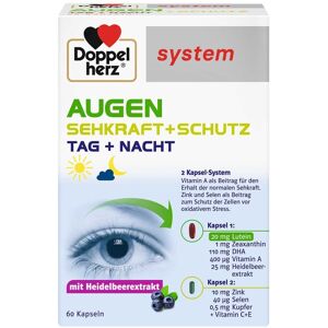 Nahrungsergänzungsmittel sind kein Ersatz für eine ausgewogene und abwechslungsreiche Ernährung und eine gesunde Lebensweise. Doppelherz® system AUGEN SEHKRAFT + SCHUTZAUGEN SEHKRAFT+SCHUTZ von Doppelherz system enthält eine Kombination aus Nährstoffen rund um die Versorgung der Augen: Mit Vitamin A für den Erhalt der normalen Sehkraft Plus Lutein, Zeaxanthin und DHA Mit Heidelbeerextrakt AUGEN SEHKRAFT+SCHUTZ von Doppelherz system enthält eine Kombination aus Nährstoffen rund um die Versorgung der Augen: ausgesuchte Vitamine und Spurenelemente sowie Omega-3-Fettsäure DHA aus hochkonzentriertem Seefischöl. Die Kapseln enthalten zusätzlich 20 mg Lutein, 1 mg Zeaxanthin und 25 mg Heidelbeerextrakt. Für den Erhalt der normalen Sehkraft ist eine entsprechende Ernährung wichtig. Das Auge ist eines der erstaunlichsten Organe des menschlichen Körpers und ist jeden Tag gefordert. Für die Gesundheit der Augen und den Erhalt der Sehkraft spielen verschiedene Faktoren eine wichtige Rolle. Hierzu zählt auch die gute Versorgung mit bestimmten Nährstoffen. Die für das Auge benötigten Vitamine und Spurenelemente kann der Körper nicht selbst bilden, sie müssen daher regelmäßig mit der Nahrung zugeführt werden. Eine augenbewusste“ Ernährung empfiehlt sich insbesondere im fortgeschrittenen Lebensalter sowie beim Vorliegen von belastenden Faktoren für die Gesundheit der Augen wie zum Beispiel: starke Beanspruchung der Augen (z. B. Arbeiten am Computer, häufiges Fernsehen, nächtliche Autofahrten), trockene Luft, Rauchen und starke Sonneneinstrahlung.AUGEN SEHKRAFT+SCHUTZ von Doppelherz system besteht aus zwei verschiedenen Kapseln. Die Inhaltsstoffe beider Kapseln sind aufeinander abgestimmt. Kapsel 1 trägt mit Vitamin A zum Erhalt der normalen Sehkraft bei. Zusätzlich ist die Omega-3-Fettsäure DHA in Kombination mit Lutein, Zeaxanthin und Heidelbeerextrakt enthalten. Kapsel 2 trägt mit den Vitaminen C + E, sowie den Spurenelementen Selen, Zink und Kupfer zum Schutz der Zellen vor oxidativem Stress bei. Das Nahrungsergänzungsmittel von Doppelherz system trägt dazu bei, dass der Körper ausreichend mit wichtigen Nährstoffen versorgt wird – mit bereits 2 Kapseln täglich. starke Beanspruchung der Augen (z. B. Arbeiten am Computer, häufiges Fernsehen, nächtliche Autofahrten) trockene Luft Rauchen starke Sonneneinstrahlung Kapsel 1:Vitamine für den Erhalt der SehkraftKapsel 1 trägt mit Vitamin A zum Erhalt der normalen Sehkraft bei. Zusätzlich ist die Omega- 3-Fettsäure DHA in Kombination mit Lutein, Zeaxanthin und Heidelbeerextrakt enthalten.Vitamin A und B2 Das fettlösliche Vitamin A und das wasserlösliche Vitamin B2 leisten einen Beitrag zum Erhalt der normalen Sehkraft. Vitamin B2 trägt zum Erhalt der normalen Schleimhäute bei. 20 mg Lutein plus 1 mg Zeaxanthin Lutein und Zeaxanthin kommen vor allem in pflanzlichen Lebensmitteln (z. B. grünem Gemüse)vor. Der so genannte Gelbe Fleck“ der Netzhaut enthält eine hohe Konzentration an Lutein und Zeaxanthin. Der Gelbe...