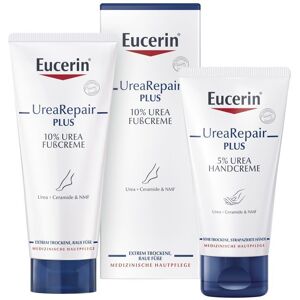 Wirkt intensiv pflegend und befeuchtend, beruhigt die Haut sofort und schützt 48 h vor Trockenheit. Selbst sehr strapazierte Hände fühlen sich wieder glatt und geschmeidig an. Die Hände sind viel häufiger kaltem Wetter, Wasser, Seife und anderen Chemikalien ausgesetzt als der restliche Körper. Dadurch ist die Haut an den Händen wesentlich anfälliger für Trockenheit, Rötungen und Irritationen. Die Eucerin UreaRepair PLUS Handcreme 5 % enthält den einzigartigen, hautverwandten Repair-PLUS-Komplex: Urea und weitere natürliche Feuchthaltefaktoren spenden und binden intensiv Feuchtigkeit und sorgen so für einen gesunden Feuchtigkeitsgehalt der Haut. Zusätzlich stärken Ceramide die physiologische Hautbarriere, damit die Feuchtigkeit nicht entweichen kann. Anwendung: Bei Bedarf mehrmals täglich eine kleine Menge Creme auf die Hand geben. Sanft in die Hände einmassieren, bis die Creme vollständig aufgenommen ist. Die Haut ist Faktoren wie Wetter, aggressiver Reinigungspflege und natürlicher Alterung ausgesetzt. Das kann zu Feuchtigkeitsverlust und somit zu Symptomen trockener Haut führen: Die Haut fühlt sich unangenehm rau an, spannt, juckt oder neigt zu Schuppenbildung. Die Produkte der UreaRepair Pflegeserie sind angereichert mit Urea (Harnstoff) und weiteren natürlichen Feuchthaltefaktoren (Natural Moisturing Factor = NMF) – für eine intensive Versorgung mit Feuchtigkeit. Eucerin UreaRepair PLUS lindert dank einzigartigem Repair-PLUS-Komplex sofort die Anzeichen trockener Haut und bietet 48 h lang anhaltenden Schutz. Eucerin UreaRepair ORIGINAL bietet Ihnen die bewährte und reichhaltige Urea-Pflege. Alle Produkte sind dermatologisch getestet und auch ideal zur Pflege trockener Haut im Alter sowie therapiebegleitend bei verschiedenen Krankheiten wie Keratosis pilaris oder Diabetes geeignet.