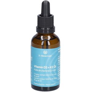 Nahrungsergänzungsmittel sind kein Ersatz für eine ausgewogene und abwechslungsreiche Ernährung und eine gesunde Lebensweise.Regulatpro® Vitamin D3 + K2 Öl – Hochdosiert & Alkoholfrei, 50 mlVitamin D3+K2 Tropfen mit 1000 IE Vitamin D3 & 20 µg Vitamin K2 pro Tropfen, auf MCT-Öl-Basis.Die Regulatpro® Vitamin D3 + K2 Tropfen bieten eine hochwertige Kombination aus natürlichem Vitamin D3 (Cholecalciferol) aus Schafswollfett (Lanolin) und Vitamin K2 (all-trans Menachinon-7) aus fermentierten Sojabohnen. Diese sind auf MCT-Öl-Basis gelöst, um eine optimale Aufnahme zu gewährleisten.Vitamin K trägt bei: zu einer normalen BlutgerinnungVitamin D trägt bei: zu einem normalen Calciumspiegel im Blut zur Erhaltung normaler Knochen, Zähne und Muskelfunktion zu einer normalen Aufnahme/Verwertung von Calcium und Phosphor zu einer normalen Funktion des Immunsystems hat eine Funktion bei der ZellteilungZutaten:MCT-Öl (Kokosöl), Vitamin D3 (Cholecalciferol), Vitamin K2 (all-trans Menachinon-7)Nährwertangaben: Nährwertangaben Nährwert Menge Pro Vitamin D3 1000 IE (25 µg) Pro 1 Tropfen Vitamin K2 20 µg Pro 1 Tropfen Verzehrempfehlung:Täglich 2 Tropfen direkt auf die Zunge oder in Wasser einnehmen.Hinweise & Aufbewahrung:Nahrungsergänzungsmittel sind kein Ersatz für eine ausgewogene und abwechslungsreiche Ernährung und eine gesunde Lebensweise. Kühl und trocken lagern.Nettofüllmenge:50 mlHersteller:Dr. Niedermaier Pharma GmbHGeorg-Knorr-Straße 185662 Hohenbrunn