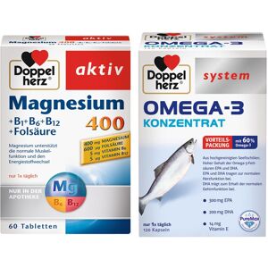 Nahrungsergänzungsmittel sind kein Ersatz für eine ausgewogene und abwechslungsreiche Ernährung als Teil eines aktiven und gesunden Lebensstils.Doppelherz® OMEGA-3 Konzentrat + aktivMagnesium 400 + B1 + B6 + B12 + FolsäureDieses Set besteht aus: Doppelherz aktivMagnesium 400 + B1 + B6 + B12 + Folsäure Doppelherz® system OMEGA-3 Konzentrat Nahrungsergänzungsmittel sind kein Ersatz für eine ausgewogene und abwechslungsreiche Ernährung und eine gesunde Lebensweise.Doppelherz aktivMagnesium 400 + B1 + B6 + B12 + Folsäure 400 mg Magnesium als Beitrag für die normale Funktion der Muskeln und des Nervensystems Vitamin B1 trägt zur normalen Herzfunktion bei Magnesium, Vitamin B6 + B12 unterstützen den normalen Energiestoffwechsel Die Herausforderungen des Alltags und körperliche Belastung durch Beruf oder Sport erfordern Energie, Muskelkraft und Nerven. Eine optimale Versorgung mit Vitaminen und Mineralstoffen ist dabei eine wichtige Voraussetzung für das Wohlbefinden und die Leistungsfähigkeit unseres Körpers.Zutaten: Magnesiumoxid, Füllstoff Cellulose, Füllstoff vernetzte Carboxymethylcellulose, Trennmittel Siliciumdioxid, Überzugsmittel Hydroxypropylmethylcellulose, Palmfett (ganz gehärtet), Trennmittel Talkum, Farbstoff , Trennmittel Calciumsalze der Speisefettsäuren, Überzugsmittel Schellack, Pyridoxinhydrochlorid, Emulgator Mono- und Diglyceride von Speisefettsäuren, Thiaminmononitrat, Olivenöl, Emulgator Polysorbat 80, Pteroylmonoglutaminsäure, Cyanocobalamin. Zusammensetzung pro 1/2 Tablette % NRV pro Tagesportion % NRV Magnesium 200 mg 53 % 400 mg 107 % Folsäure 300 µg 150 % 600 µg 300 % Vitamin B1 2,1 mg 191 % 4,2 mg 382 % Vitamin B6 2,5 mg 179 % 5 mg 357 % Vitamin B12 2,5 µg 100 % 5 µg 200 % Verzehrsempfehlung:Täglich 1/2 - 1 Tablette zu einer Mahlzeit mit ausreichend Flüssigkeit unzerkaut einnehmen. Bei erhöhtem Magnesiumbedarf aufgrund starker körperlicher Belastung in Beruf und Sport in Verbindung mit einer magnesiumarmen Ernährung, 1 Tablette einnehmen. Liegt lediglich eine unausgewogene Ernährung vor, 1/2 Tablette einnehmen.Hinweis:Die angegebene empfohlene Tagesmenge darf nicht überschritten werden. Aufbewahrung:Kühl (6-25 °C) und lichtgeschützt lagern. Außerhalb der Reichweite von kleinen Kindern aufbewahren.Nettofüllmenge: 60 Tabletten = 76,2 g Doppelherz® System Omega-3 Konzentrat Hochgereinigtes Konzentrat aus Seefischölen - in PureMax™-Qualität * Mit 300 mg EPA und 200 mg DHA pro Kapsel als Beitrag für die normale Herzfunktion und DHA für die normale Gehirnfunktion nur 1 x täglich *PureMax™ ist eine Marke der Croda International PLC, England Die OMEGA-3 KONZENTRAT Kapseln von Doppelherz system enthalten ein hochgereinigtes Konzentrat aus Seefischölen und bieten dadurch folgende Vorteile: • 300 mg EPA + 200 mg DHA – hohe Konzentration an Omega-3-Fettsäuren • Nur 1 Kapsel täglich – verringerte Einnahmemenge• bedarfsgerechte Omega-3-Versorgung in verschiedenen LebensphasenOMEGA-3 KONZENTRAT von Doppelherz system aus...