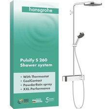 hansgrohe Pulsify Showerpipe 24230000 bestehend aus Kopfbrause Handbrause Wannenthermostat Brausestange Handbrausehalterung Brauseschlauch Kopfbrause Pulsify 260 1jet Strahlart Kopfbrause PowderRain Kugelgelenk: Kopfbrause im Winkel verstellbar abnehmbare Kopfbrause Strahlart Handbrause PowderRain IntenseRain Massagestrahl Ablage aus Kunststoff höhenverstellbare Handbrausehalterung mit Push Schieber Steigrohr in der Höhe ablängbar Brausearmlänge Kopfbrause 398 mm schwenkbarer Brausearm CoolContact am Thermostat verhindert ein Aufheizen des Gehäuses und macht Duschen so noch sicherer Thermostat Shower Tablet Select 400 Sicherheitssperre bei 40 °C gleichzeitige Nutzung von 3 Verbrauchern Montageart: Aufputzinstallation Stichmaß 150 +/-12 mm Thermostat wird geliefert mit Tasten Wanne Handbrause Kopfbrause Quick Clean mit der schnellen Entleerungsfunktion der Brause wird die Nachtropfzeit reduziert einfache Wassersteuerung: über den Drehregler kann die Wassermenge eingestellt werden der Wanneneinlauf kann ganz bequem unter das Thermostat geschwenkt werden wenn er nicht benutzt wird ab Mitte Februar 2022 lieferbar