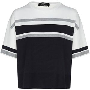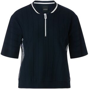 Damen Kurzarmpullover aus stretchigem Baumwollmix Gerippter Rundhalskragen Gerippter Kurzarm mit Kontraststreifen Ringelmuster auf der Brust Relaxed Fit Verkürzte Passform Farbbezeichnung: Navy Material: 65% Baumwolle, 28% Polyester, 5% Bio-Baumwolle, 2% Polyamid Rückenteil: 47% Polyamid, 44% Viskose, 9% Elasthan