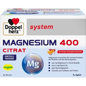 Anwendungsgebiet von Doppelherz system Magnesium 400 CitratDie Portionsbeutel von Doppelherz system tragen mit 400 mg Magnesium in Citratform zu einer normalen Muskelfunktion und mit Vitamin B6 zur normalen Funktion des Nervensystems bei. Der Mineralstoff Magnesium ist im Granulat von Doppelherz system in seiner Citratverbindung enthalten. Magnesiumcitrat ist eine organische Form des Magnesiums. Magnesium ist ein lebensnotwendiger Mineralstoff, den der Körper nicht selbst bilden kann. Außerdem ist eine Speicherung nur in begrenztem Umfang möglich. Magnesium unterstützt den normalen Energiestoffwechsel sowie die normale Funktion des Nervensystems. Eine ausreichende Magnesiumversorgung leistet einen Beitrag zur normalen Muskelfunktion. Der Mineralstoff trägt zum Elektrolytausgleich bei. Vitamin B6 trägt zum normalen Eiweiß- und Glykogenstoffwechsel bei. Es spielt eine Rolle für die normale Funktion des Nervensystems. Vitamin C leistet einen Beitrag zu einer normalen Funktion des Immunsystems und trägt dazu bei die Zellen vor oxidativem Stress zu schützen. Bei unausgewogener Ernährung oder einem erhöhten Nährstoffbedarf, z. B. durch körperliche Belastung (z. B. Sport) oder eine ungesunde Lebensweise (z. B. Alkoholgenuss) kann die Ernährung so gezielt ergänzt werden.Wirkungsweise von Doppelherz system Magnesium 400 CitratDas Doppelherz system Magnesium 400 Citrat enthält in seiner Citratverbindung Magnesium. Magnesiumcitrat ist deshalb eine organische Verbindung und fördert die normale Muskelfunktion. Viele wichtige Vitamine und Mineralien für unseren Körper können wir nicht selbst herstellen und müssen diese über die Nahrung aufnehmen. In Situationen in denen Ihr Körper mehr als normalerweise benötigt (z.B. bei körperlicher Belastung, Sport und ungesunder Lebensweise), entsteht dann ein Mangel an wichtigen Nährstoffen. Auch eine unzureichende Aufnahme der wichtigen Nährstoffe kann dazu führen. Mit Doppelherz system Mag