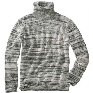 Aus ihm spricht die Erfahrung. Als zögen Lebenslinien über ihn, mal dicker, mal mit Leerstellen. Tatsächlich ist das italienische Garn dafür zweifarbig eingefärbt, immer unterschiedlich in der Breite und Dicke und damit so individuell. Viel Wolle trifft dabei auf eine ausgereifte Mischung aus formstabilem Polyamid, leichter Viskose und einem Schuss Polyacryl, damit er auch nach vielem Waschen noch immer gut aussieht. Easy zu kombinieren, passt zu Jeans oder dunkler Chino.