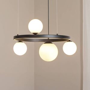 Die Hängeleuchte Garda 4 wurde minimalistisch gestaltet und besteht aus einer langen, schwarzen Metallstange, die einseitig am Kabel vom Baldachin abhängt, an der anderen Seite mit einem Stahlseil an der Decke befestigt wird. Die Stange hält eine große und drei kleine Kugeln aus opalweißem Glas. In der großen Kugel sitzt eine E27-Fassung, in den drei kleinen eine E14-Fassung.