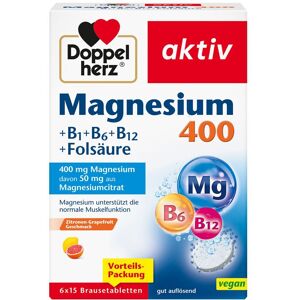 Nahrungsergänzungsmittel sind kein Ersatz für eine ausgewogene und abwechslungsreiche Ernährung und eine gesunde Lebensweise. Doppelherz® aktiv Magnesium 400 + B1 + B6 + B12 + Folsäure Brausetabletten 400 mg Magnesium zur Unterstützung des normalen Energiestoffwechsels und der Muskelfunktion Vitamin B1 trägt zur normalen Herzfunktion bei Gut auflösende Brausetablette mit frischem Zitronen-Geschmack Eine optimale Versorgung mit Vitaminen und Mineralstoffen ist eine wichtige Voraussetzung für das Wohlbefinden und die Leistungsfähigkeit unseres Körpers. Magnesium ist ein lebensnotwendiger Mineralstoff, den der Körper nicht selber bilden kann. Außerdem ist eine Speicherung nur in begrenztem Umfang möglich. Die Brausetabletten von Doppelherz enthalten neben 400 mg Magnesium - 50 mg Magnesium in Form von Magnesiumcitrat - ausgewählte B-Vitamine, einschließlich der Folsäure. Für die normale Funktion des Nervensystems spielen die Vitamine B1, B6 und B12 eine Rolle. Folsäure hat eine Funktion bei der Zellteilung und leistet einen Beitrag zur normalen Blutbildung. Eine Nahrungsergänzung mit Doppelherz Magnesium 400+B1+B6+B12+Folsäure Brausetabletten empfiehlt sich bei unausgewogener Ernährung oder einem erhöhten Nährstoffbedarf. Nahrungsergänzungsmittel mit Süßungsmitteln Brausetablette mit Magnesium und B-Vitaminen Zutaten: Säuerungsmittel Citronensäure, Magnesiumcarbonat, Säureregulatoren Natriumhydrogencarbonat und Natriumcarbonat, Trimagnesiumdicitrat, Süßungsmittel Natriumcyclamat und Natriumsaccharin, Aroma, Stärke, Vitamin B6, Vitamin B1, Folsäure, Farbstoff Riboflavin-5'-Phosphat, Vitamin B12 Nährwerte: Zusammensetzung pro Tagesportion (= 1 Brausetablette) % NRV* Magnesium 400 mg 107 % Folsäure 600 μg 300 % Vitamin B1 1,1 mg 100 % Vitamin B6 4,2 mg 300 % Vitamin B12 5,0 μg 200 % * Nährstoffbezugswerte gemäß EU-Verordnung 1169/2011 Verzehrsempfehlung: Eine Tablette täglich in einem Glas Wasser (200 ml) aufgelöst trinken. Hinweis: Die angegebene empfohlene tägliche Verzehrsmenge darf nicht überschritten werden. Nahrungsergänzungsmittel sind kein Ersatz für eine ausgewogene und abwechslungsreiche Ernährung und gesunde Lebensweise. Für kleine Kinder unzugänglich aufbewahren. Nur für Erwachsene. Mengen über 250 mg Magnesium können bei empfindlichen Personen abführend wirken.. Aufbewahrung: Bei Raumtemperatur trocken aufbewahren. Außerhalb der Reichweite von kleinen Kindern aufbewahren. Nettofüllmenge: 6 x 15 Tabletten Herstellerdaten: Queisser Pharma GmbH & Co. KG Schleswiger Str. 74 24941 Flensburg