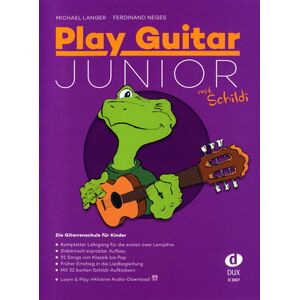 Edition Dux Play Guitar Junior mit Schildi: Gitarrenschule für Kinder ab 6 Jahren, von Michael Langer und Ferdinand Neges, in Standardnotation, ISBN 9783868492644, ISMN 9790500174066, D3507, 23 x 30 cm, 96 Seiten, Spiralbindung, inkl. Download zu Demoaufnahmen, in deutscher Sprache