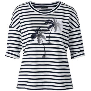 Damen T-Shirt aus Baumwoll-Stretch Rundhalsausschnitt 3/4 Ärmel Ringelmuster Palmenprint am Vorderteil Gerade Passform Farbbezeichnung: Midnight Blue Material: 94% Baumwolle, 6% Elasthan