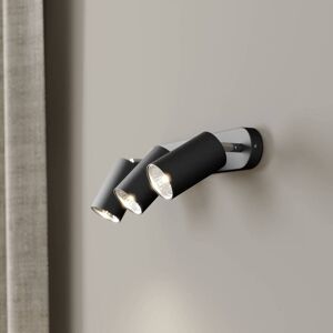 Drei Schirme in Form von Zylindern aus lackiertem Metall sitzen mit Gelenken und einem kleinen Ausleger versehen am länglichen Baldachin mit abgerundeten Kanten. Sie lassen sich schwenken, um das Licht in unterschiedliche Richtungen zu lenken. Ein vielseitiger Lichtspender für Wohnräume, Flure u. a.
