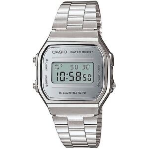 Modell: A168WEM-7EF Herren Uhr Spiegelglänzendes Zifferblatt Wasserdicht •Alarm 1/100-Sek.-Stoppuhr Elektrolumineszierende Hintergrundbeleuchtung Gehäusegröße (L x B x H): 38.6 × 36.3 × 9.6 mm Gewicht: 49 g Gehäuse- und Lünettenmaterial: Kunstharz/verchromt Band aus Edelstahl Verstellbarer Verschluss 7 Jahre - 1 Batterie Wasserdichtigkeits-Klassifizierung (WR) nach ISO 22810 Genauigkeit: ±30 Sekunden pro Monat Farbbezeichnung: Silber