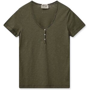 Damen T-Shirt aus reiner Bio-Buamwolle V-Ausschnitt Kurze Knopfleiste Kurzarm Gerade Passform Unifarben Farbbezeichnung: Burntolive Material: 100% Bio-Baumwolle
