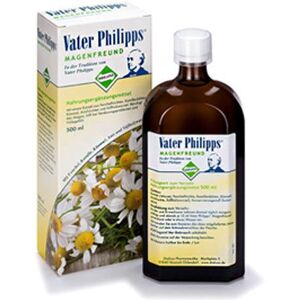 Nahrungsergänzungsmittel sind kein Ersatz für eine ausgewogene und abwechslungsreiche Ernährung und eine gesunde Lebensweise. Vater Philipps® MagenfreundVater Philipps® Magenfreund enthält einen aus fünf verschiedenen Pflanzen gewonnenen Extrakt, der zur Beruhigung des Magens beitragen kann. Ebensokann Vater Philipps® Magenfreund bei Verdauungsproblemen und Völlegefühl behilflich sein.Fenchel wirkt beruhigend bei Magen- und Darmbeschwerden, wie beispielsweise Völlegefühl. Auch bei Blähungen wirkt Fenchel wohltuend. Die krampflösende Wirkung der Kamille macht man sich zu Nutze bei Blähungen und bei krampfartigen Beschwerden im Magen- und Darmbereich sowie bei Menstruationsbeschwerden.Kümmel regt die Tätigkeit der Verdauungsdrüsen an und hat beachtlich blähungswidrige und krampflösende Eigenschaften. Man verwendet ihn bei Verdauungsstörungen mit Blähungen und Völlegefühl, bei leichten Krämpfen im Magen-, Darm- und Gallenbereich sowie bei nervösen Herz-Magen-Beschwerden.Anis wirkt krampflösend z.B. bei Blähungen, Verstopfung und Magenkrämpfen. Die Süßholzwurzel vermindert die Magensäurebildung und kann sich bei einer Gastritis positiv auswirken.Zutaten: Extrakt (Wasser, Fenchelfrüchte, Kamillenblüten, Kümmel, Anisfrüchte, Süßholzwurzel), Konservierungsstoff Sorbinsäure. Nährwert 45 ml Flüssigkeit (Tagesdosis) enthalten einen Extrakt aus: 100 ml Flüssigkeit enthalten einen Extrakt aus: Fenchelfrüchte 0,68 g* 1,50 g Kamillenblüten 0,56 g* 1,24 g Kümmel 0,56 g* 1,24 g Anisfrüchte 0,40 g* 0,89 g Süßholzwurzel 0,23 g* 0,51 g *noch keine Empfehlung der EU zum Tagesbedarf vorhandenVerzehrempfehlung: Kinder und Erwachsene nehmen dreimal täglich morgens, mittags und abends je 15 ml Vater Philipps® Magenfreund unverdünnt oder in etwas Wasser ein. Verwenden Sie zum Dosieren von Vater Philipps® Magenfreund den dazu mitgelieferten Messbecher auf dem Schraubverschluss der Flasche.Vor Gebrauch schütteln!Hinweis: Vater Philipps® Magenfreund ist ein Naturprodukt. Trübungen haben keinen Einfluss auf die Qualität des Produktes.Aufbewahrung: Nach Anbruch sollte die Flasche im Kühlschrank gelagert und innerhalb von einem Monat aufgebraucht werden. Nach Ablauf dieser Zeit sollte überschüssiger Inhalt nicht mehr verwendet werden. Nettofüllmenge:500 mlHerstellerdaten:Dreluso PharmazeutikaDr. Elten und Sohn GmbHMarktplatz 531840 Hessisch Oldendorf
