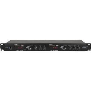 Dualer 1HE-Medienplayer für die 19"-Rackmontage mit unabhängiger Steuerung, FM-Radio, USB-/SD-Karte, Bluetooth 4.2 und Paging-Mikrofon, Eingänge: 3,5-mm-Klinke, Paging-Mikrofon, USB-A, SD-Karte und 2x Cinch, Geeignet für große Geschäfte, Einkaufszentren, Fitnessstudios usw. IR-Fernbedienung und Paging-Mikrofonschnittstelle enthalten, Der DAP MP-220BT ist ein vielseitiger dualer Medienplayer mit FM-Radio, Bluetooth 4.2, USB-/SD-Player für MP3-Dateien, zwei Line-Eingängen und einem Eingang für ein Paging-Mikrofon. Er ist für Anwendungsbereiche mit zwei unterschiedlichen Audiofeeds konzipiert, wie etwa für größere Geschäfte, Einkaufszentren, Fitnessstudios usw. Auf der Rückseite ist er mit zwei Cinch-Line-Eingängen und einem Eingang für ein Paging-Mikrofon ausgestattet, die über Bass-, Höhen- und Verstärkungseinstellungen verfügen. Der Eingang für das Paging-Mikrofon hat eine Priority-Einstellung, die Möglichkeit, Zonen auszuwählen, und Phantomspeisung. Auf der Vorderseite befinden sich zwei USB-A-Anschlüsse für die Wiedergabe von MP3-Dateien von einem USB-Speichergerät oder einem externen Laufwerk sowie zwei SD-Kartensteckplätze (FAT32/bis 32 GB). An den Miniklinkeneingang können Sie ein Smartphone oder einen Laptop anschließen.Der MP-220BT besteht im Grunde aus zwei kombinierten Medienplayern in einem Gehäuse. Beide Player können auf alle Quellen zugreifen, haben aber unabhängige Eingangsauswahlschalter, eigene Bass-, Höhen- und Lautstärkeregler sowie getrennte Ausgänge in der Form von unsymmetrischen RCA- und symmetrischen Phoenix-Anschlüssen. Sie können das FM-Radio und den MP3-Player über das Display und die Tasten auf der Vorderseite oder über die mitgelieferte IR-Fernbedienung steuern.Technische Daten: Stereo-Eingänge: 2, Aux-Eingänge: 1, Hauptausgänge: 2, Unterstützte Audiodateien: FLAC / MP3 / WAV, Maximale Speichergröße: 32 GB, Medien-Eingang/Ausgang: USB-A / SD Card, Bluetooth-Version: 4.2, Bluetooth-Reichweite: 20 m, FM-Frequenz Start: 87.5 MHz, FM-Frequenz Ende: 108 MHz, Stromversorgung: 220-240 V AC 50 Hz, Stromverbrauch: 9 W, Höhe (mm): 44.5 mm, Tiefe (mm): 130 mm, Breite (mm): 483 mm, Rack-Einheiten: 1 U