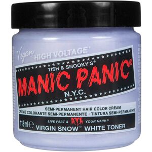 Die semi-permanente Haarfarbe High Voltage Classic von Manic Panic umfasst eine Vielzahl an leuchtenden Farbtönen. Die verwendeten hochwertigen Inhaltsstoffe stellen sicher, dass du ein hochwertiges Farbergebnis erhältst. Die pflegenden Inhaltsstoffe in der Formel konditionieren das Haar während des Färbens und sorgen so für ein seidig-glänzendes Finish sowie ein geschmeidiges Haargefühl.Virgin Snow ist eine blaue Haartönung, die dazu beiträgt, den Messingstich bei blonden Haaren der Stufe 10 oder höher zu entfernen. Pastel- & Grautöne enthalten weniger Pigmente als die lebhaften Farbtöne von Manic Panic und verblassen daher schneller. Verwende Virgin Snow, um einen kühlen Farbton als Basis zu kreieren bevor du mit helleren Manic Panic Farben färbst, oder um einfach dein Blond aufzufrischen. Wichtige Merkmale:Erforderliches Haarlevel: 10 oder höherIntensität: HellLanglebigkeit der Farbe: GeringUV-reaktiv: NeinManic Panic Haarfarben sind gebrauchsfertig und es ist kein Entwickler erforderlich.Vegan und tierversuchsfreiFrei von: PPD, Parabenen, Ammoniak, Resorcin, Phthalaten und GlutenEtwa 4 - 6 Wochen lang anhaltende FarbeVerblasst allmählich mit jeder HaarwäscheFarbtöne sind untereinander mischbarKombinierbar mit dem Pastel-izer, um sanfte, trendige Pastelltöne zu kreieren8 UV-reaktive Farbtöne erhältlich, die unter Schwarzlicht leuchtenGebrauchsfertig, kein Entwickler nötigBeste Ergebnisse bei voraufgehelltem HaarHergestellt in den USAWie viele 118 ml Dosen brauche ich für mein Haar?Kurzes bis boblanges Haar: 1 - 2 Dosen, je nach Haardicke. Schulter- bis taillenlanges Haar: 2 - 3 Dosen, je nach Haardicke. Bei dickem Haar kann eine zusätzliche Dose für die Spitzen erforderlich sein. Taillenlanges und längeres Haar: 3+ Dosen, je nach Dicke des Haares.Anwendung:1. Das Haar mit einem tiefenreinigenden Shampoo waschen, keine Spülung verwenden.2. Trockne das Haar mit einem Föhn, um sicherzustellen, dass das Haar extrem porös ist.3. Ziehe Handschuhe an und trage die Tönung Strähne für Strähne mit einem Färbepinsel auf. Stelle sicher, dass jede Haarsträhne mit ausreichend Farbe bedeckt ist, um ein fleckiges Ergebnis zu vermeiden.4. Kämme anschließend das Haar durch, um sicherzustellen, dass die Farbe gleichmäßig verteilt wird. Die Farbcreme kann leicht schaumig werden.5. Decke das Haar mit einer Plastikhaube ab und lass die Farbe 30-45 Minuten einwirken. Für mehr Intensität unter einer Wärmequelle einwirken lassen.6. Spüle das Haar mit kaltem Wasser aus, bis das Wasser klar ist. Kontakt mit Gesicht und Körper vermeiden. Haare nicht shampoonieren.7. Wie gewünscht stylen. Um Farbübertragungen zu vermeiden, bitte immer sicherstellen, dass das Haar vollständig getrocket ist.Warnhinweise: Nur zur äußeren Anwendung. Außerhalb der Reichweite von Kindern aufbewahren. Nur nach Anweisung verwenden. Dieses Produkt enthält Inhaltsstoffe, die bei bestimmten Personen zu Hautreizungen führen können; daher sollte zunächst ein Vorversuch gemäß den beiliegenden...